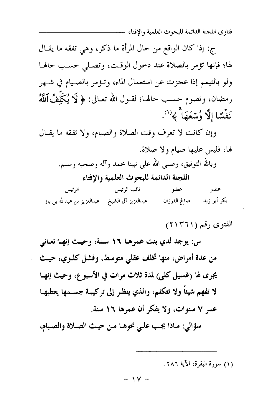 ج: إذا كان الواقع من حال المرأة ما ذكر، وهي تفقه ما يقال لها؛ فإنها تؤمر بالصلاة عند دخول الوقت، وتصلي حسب حالها ولو بالتيمم إذا عجزت عن استعمال الماء، وتؤمر بالصيام في شهر رمضان، وتصوم حسب حالها؛ لقول الله تعالى: {لَا يُكَلِّفُ اللَّهُ نَفْسًا إِلَّا وُسْعَهَا} (¬1) .