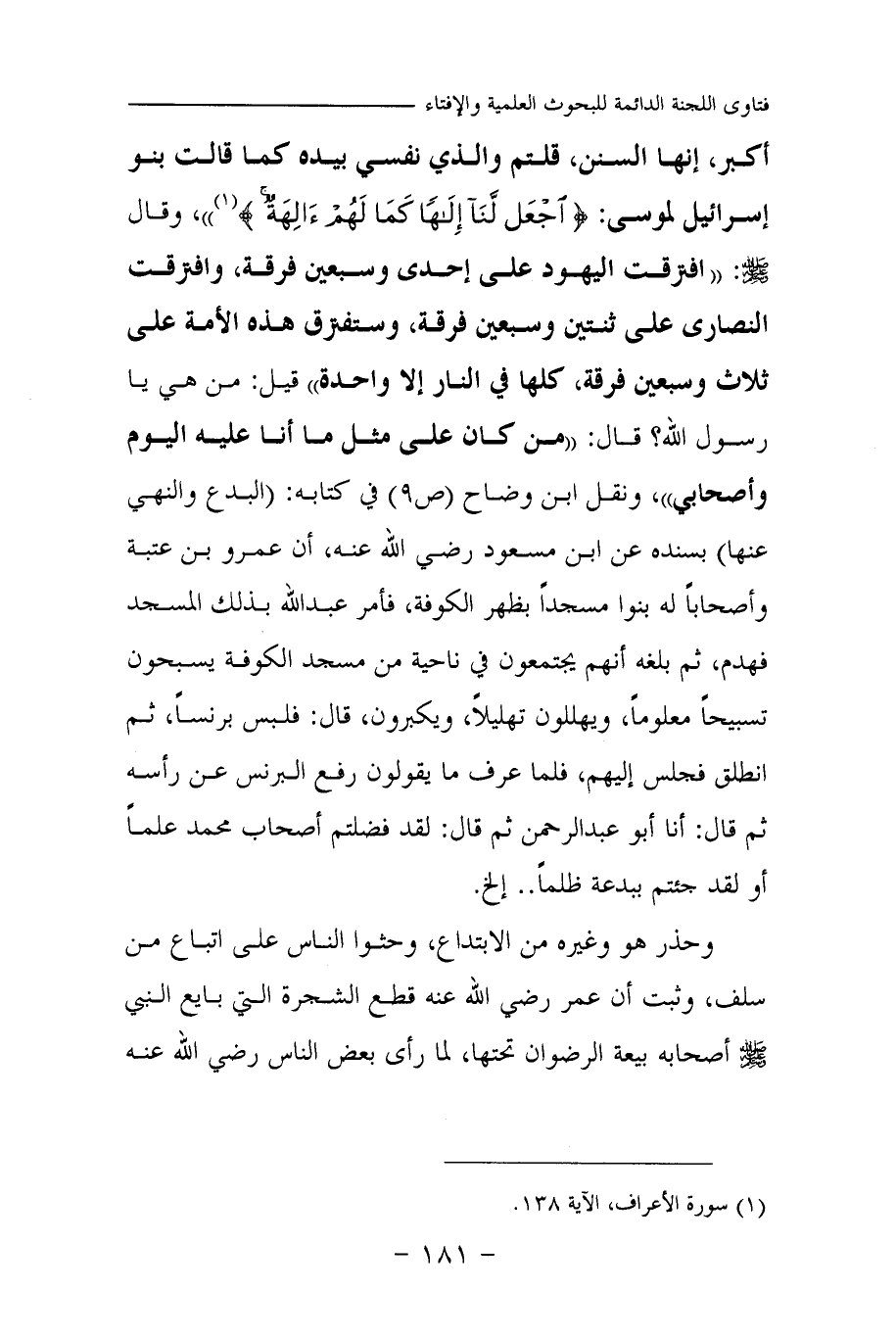 «الله أكبر، إنها السنن، قلتم والذي نفسي بيده كما قالت بنو إسرائيل لموسى: (¬2) » وقال صلى الله عليه وسلم: «افترقت اليهود على إحدى وسبعين فرقة، وافترقت النصارى على ثنتين وسبعين فرقة، وستفترق هذه الأمة على ثلاث وسبعين فرقة، كلها في النار إلا واحدة. قيل: من هي يا رسول الله؟ قال: من كان على مثل ما أنا عليه اليوم وأصحابي (¬3) » ، ونقل ابن وضاح (ص 9) في كتابه: (البدع والنهي عنها) بسنده عن ابن مسعود رضي الله عنه، أن عمرو بن عتبة وأصحابا له بنوا مسجدا بظهر الكوفة، فأمر عبد الله بذلك المسجد فهدم، ثم بلغه أنهم يجتمعون في ناحية من مسجد الكوفة يسبحون تسبيحا معلوما، ويهللون تهليلا، ويكبرون، قال: فلبس برنسا، ثم انطلق فجلس إليهم، فلما عرف ما يقولون رفع البرنس عن رأسه ثم قال: أنا أبو عبد الرحمن ثم قال: لقد فضلتم أصحاب محمد علما أو لقد جئتم ببدعة ظلما. . إلخ.
