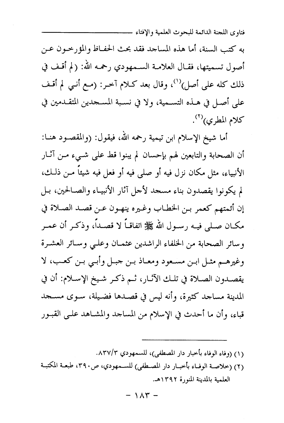 أما شيخ الإسلام ابن تيمية رحمه الله، فيقول: (والمقصود هنا: أن الصحابة والتابعين لهم بإحسان لم يبنوا قط على شيء من آثار الأنبياء، مثل مكان نزل فيه أو صلى فيه أو فعل فيه شيئا من ذلك، لم يكونوا يقصدون بناء مسجد لأجل آثار الأنبياء والصالحين، بل إن أئمتهم كعمر بن الخطاب وغيره ينهون عن قصد الصلاة في مكان صلى فيه رسول الله صلى الله عليه وسلم اتفاقا لا قصدا، وذكر أن عمر وسائر الصحابة من الخلفاء الراشدين عثمان وعلي وسائر العشرة وغيرهم مثل ابن مسعود ومعاذ بن جبل وأبي بن كعب، لا يقصدون الصلاة في تلك الآثار، ثم ذكر شيخ الإسلام: أن في المدينة مساجد كثيرة، وأنه ليس في قصدها فضيلة، سوى مسجد قباء، وأن ما أحدث في الإسلام من المساجد والمشاهد على القبور