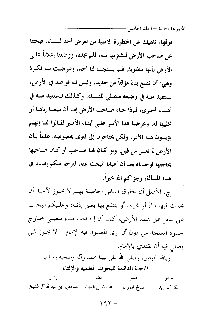 ج: الأصل أن حقوق الناس الخاصة بهم لا يجوز لأحد أن يحدث فيها بناء أو غيره، أو ينتفع بها بغير إذنه، وعليكم البحث عن بديل غير هذه الأرض، كما أن إحداث بناء مصلى خارج حدود المسجد من دون أن يرى المصلون فيه الإمام - لا يجوز لمن يصلي فيه أن يقتدي بالإمام.