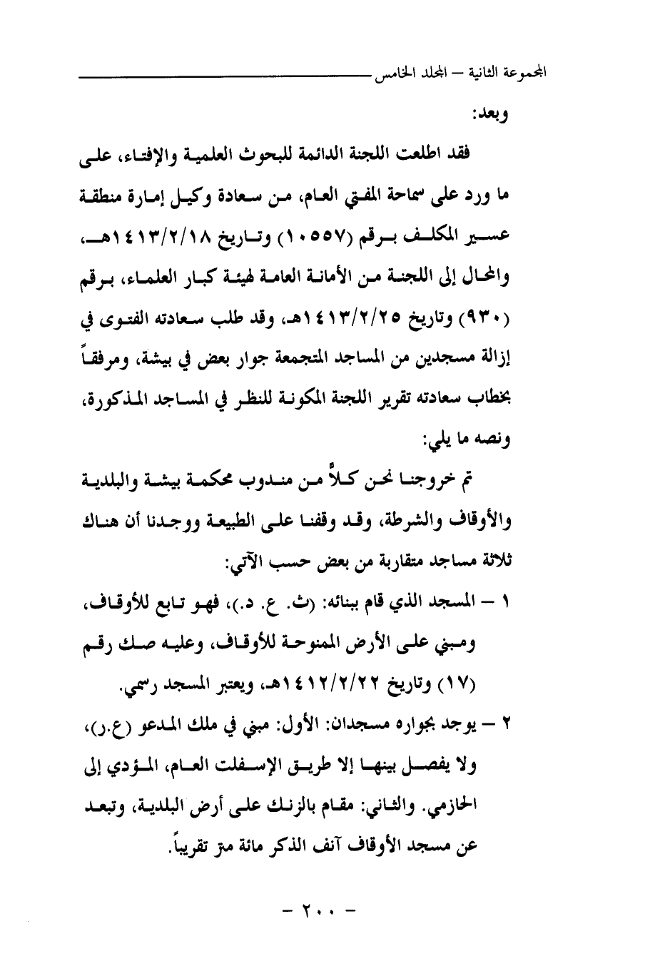 فقد اطلعت اللجنة الدائمة للبحوث العلمية والإفتاء، على ما ورد على سماحة المفتي العام، من سعادة وكيل إمارة منطقة عسير المكلف برقم (10557) وتاريخ 18\2\1413 هـ، والمحال إلى اللجنة من الأمانة العامة لهيئة كبار العلماء، برقم (930) وتاريخ 25\2\1413 هـ وقد طلب سعادته الفتوى في إزالة مسجدين من المساجد المتجمعة جوار بعض في بيشة، ومرفقا بخطاب سعادته تقرير اللجنة المكونة للنظر في المساجد المذكورة، ونصه ما يلي: