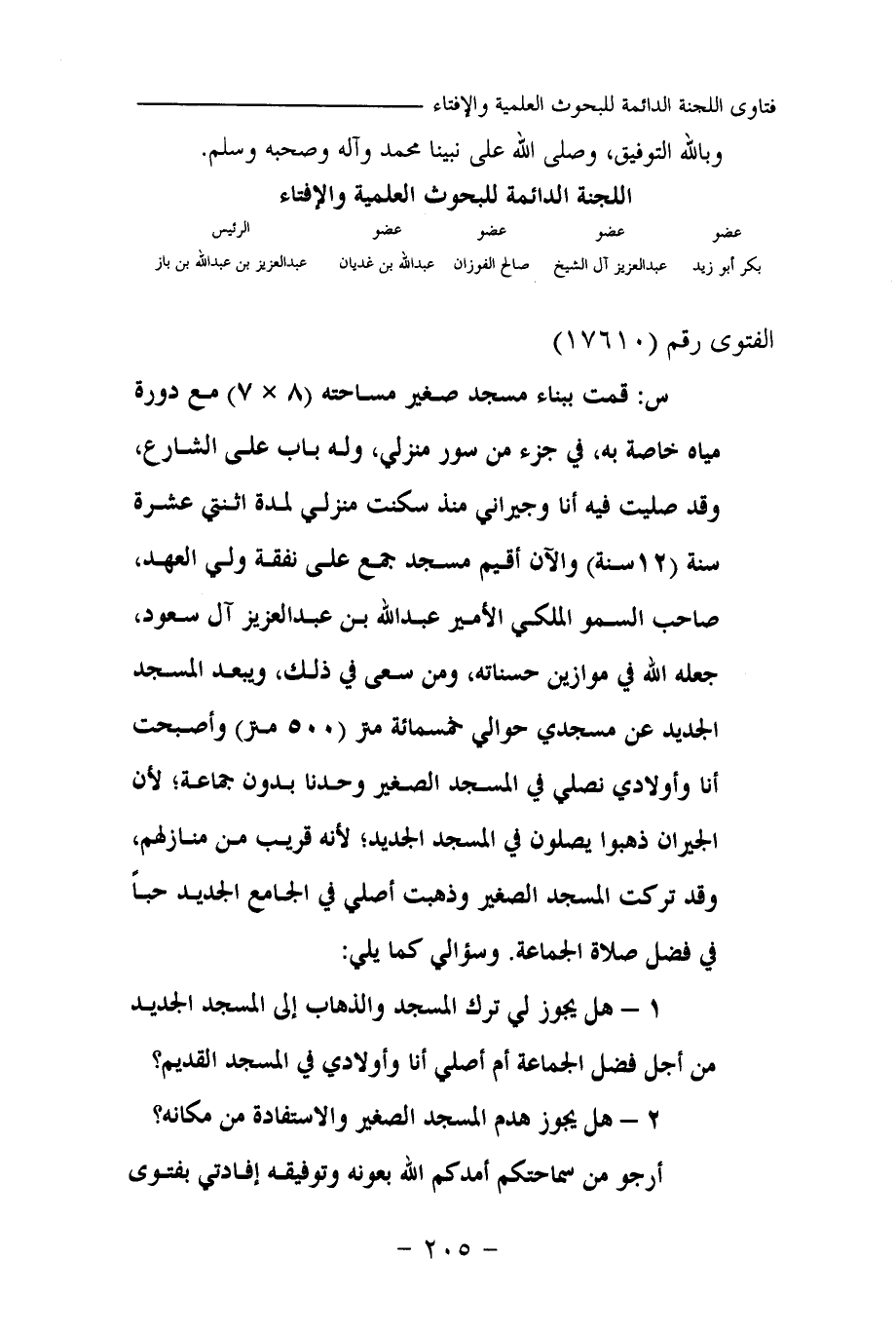 س: قمت ببناء مسجد صغير مساحته (8 × 7) مع دورة مياه خاصة به، في جزء من سور منزلي، وله باب على الشارع، وقد صليت فيه أنا وجيراني منذ سكنت منزلي لمدة اثنتي عشرة سنة (12 سنة) والآن أقيم مسجد جمع على نفقة ولي العهد، صاحب السمو الملكي الأمير عبد الله بن عبد العزيز آل سعود، جعله الله في موازين حسناته، ومن سعى في ذلك، ويبعد المسجد الجديد عن مسجدي حوالي خمسمائة متر (500 متر) وأصبحت أنا وأولادي نصلي في المسجد الصغير وحدنا بدون جماعة؛ لأن الجيران ذهبوا يصلون في المسجد الجديد؛ لأنه قريب من منازلهم، وقد تركت المسجد الصغير وذهبت أصلي في الجامع الجديد حبا في فضل صلاة الجماعة. وسؤالي كما يلي: