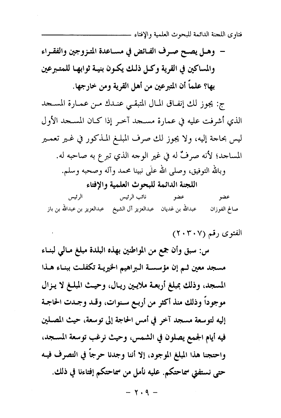 س: سبق وأن جمع من المواطنين بهذه البلدة مبلغ مالي لبناء مسجد معين ثم إن مؤسسة البراهيم الخيرية تكفلت ببناء هذا المسجد، وذلك بمبلغ أربعة ملايين ريال، وحيث المبلغ لا يزال موجودا وذلك منذ أكثر من أربع سنوات، وقد وجدت الحاجة إليه لتوسعة مسجد آخر في أمس الحاجة إلى توسعة، حيث المصلين فيه أيام الجمع يصلون في الشمس، وحيث نرغب توسعة المسجد، واحتجنا هذا المبلغ الموجود، إلا أننا وجدنا حرجا في التصرف فيه حتى نستفتي سماحتكم. عليه نأمل من سماحتكم إفتاءنا في ذلك.