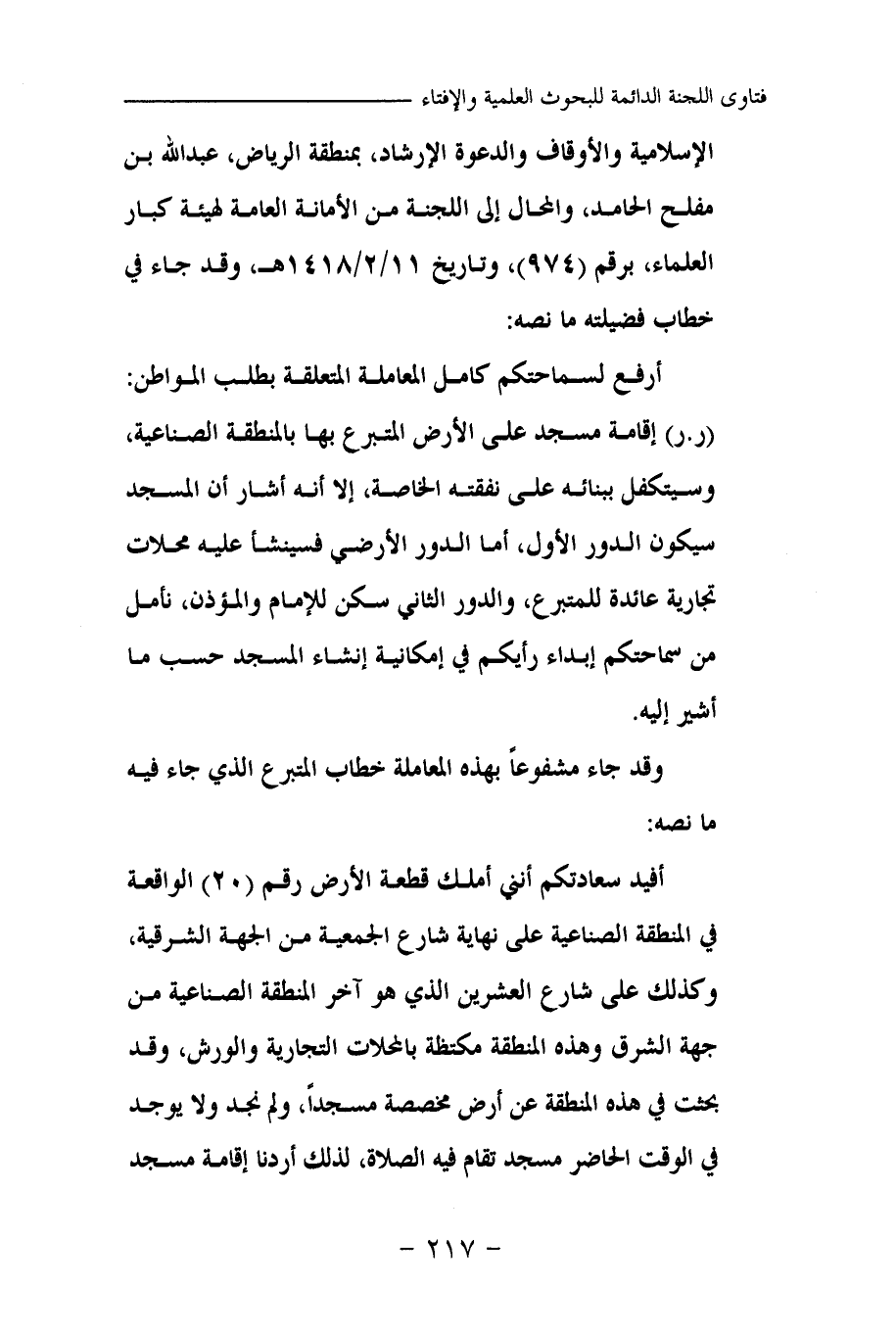 أفيد سعادتكم أنني أملك قطعة الأرض رقم (20) الواقعة في المنطقة الصناعية على نهاية شارع الجمعية من الجهة الشرقية، وكذلك على شارع العشرين الذي هو آخر المنطقة الصناعية من جهة الشرق وهذه المنطقة مكتظة بالمحلات التجارية والورش، وقد بحثت في هذه المنطقة عن أرض مخصصة مسجدا، ولم نجد ولا يوجد في الوقت الحاضر مسجد تقام فيه الصلاة، لذلك أردنا إقامة مسجد