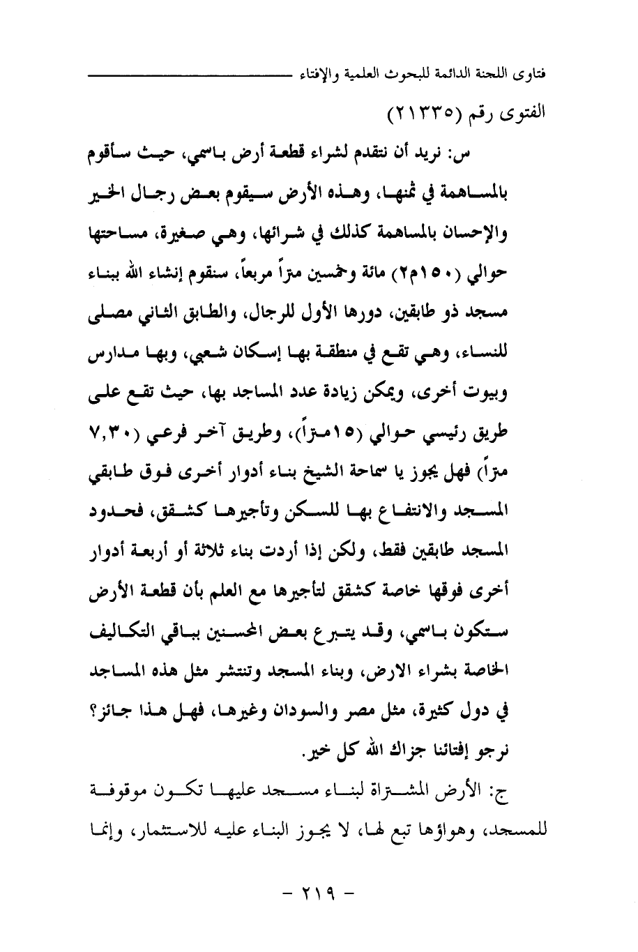 س: نريد أن نتقدم لشراء قطعة أرض باسمي، حيث سأقوم بالمساهمة في ثمنها، وهذه الأرض سيقوم بعض رجال الخير والإحسان بالمساهمة كذلك في شرائها، وهي صغيرة، مساحتها حوالي (150م2) مائة وخمسين مترا مربعا، سنقوم إن شاء الله ببناء مسجد ذو طابقين، دورها الأول للرجال، والطابق الثاني مصلى للنساء، وهي تقع في منطقة بها إسكان شعبي، وبها مدارس وبيوت أخرى، ويمكن زيادة عدد المساجد بها، حيث تقع على طريق رئيسي حوالي (15 مترا) ، وطريق آخر فرعي (7.30 مترا) فهل يجوز يا سماحة الشيخ بناء أدوار أخرى فوق طابقي المسجد والانتفاع بها للسكن وتأجيرها كشقق، فحدود المسجد طابقين فقط، ولكن إذا أردت بناء ثلاثة أو أربعة أدوار أخرى فوقها خاصة كشقق لتأجيرها مع العلم بأن قطعة الأرض ستكون باسمي، وقد يتبرع بعض المحسنين بباقي التكاليف الخاصة بشراء الأرض، وبناء المسجد، وتنتشر مثل هذه المساجد في دول كثيرة، مثل مصر والسودان وغيرها، فهل هذا جائز؟ نرجو إفتاءنا جزاك الله كل خير.