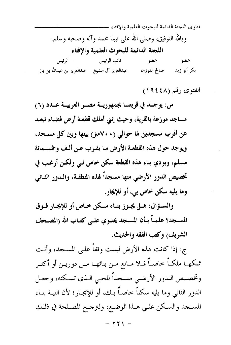 س: يوجد في قريتنا بجمهورية مصر العربية عدد (6) مساجد موزعة بالقرية، وحيث إنني أملك قطعة أرض فضاء تبعد عن أقرب مسجدين لها حوالي (700 متر) بينها وبين كل مسجد، ويوجد حول هذه القطعة الأرض ما يقرب عن ألف وخمسمائة مسلم، وبودي بناء هذه القطعة سكن خاص لي ولكن أرغب في تخصيص الدور الأرضي منها مسجدا لهذه المنطقة، والدور الثاني وما يليه سكن خاص بي، أو للإيجار.