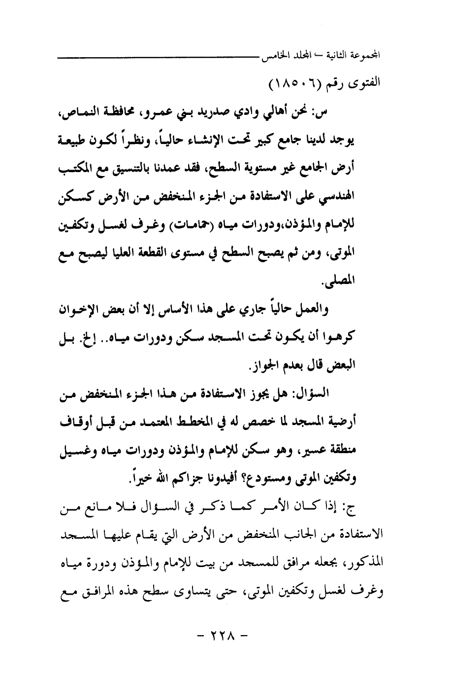 السؤال: هل يجوز الاستفادة من هذا الجزء المنخفض من أرضية المسجد لما خصص له في المخطط المعتمد من قبل أوقاف منطقة عسير، وهو سكن للإمام والمؤذن ودورات مياه وغسيل وتكفين الموتى ومستودع؟ أفيدونا جزاكم الله خيرا.