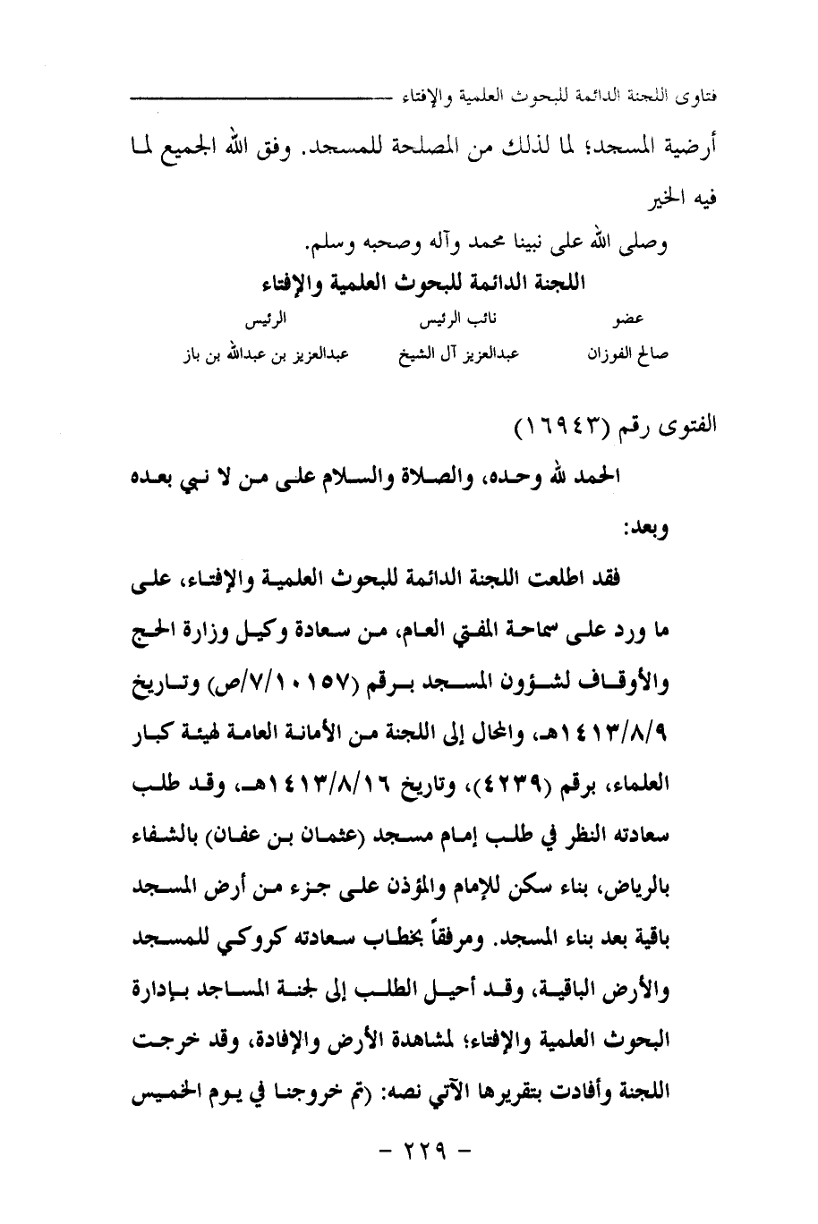 فقد اطلعت اللجنة الدائمة للبحوث العلمية والإفتاء، على ما ورد على سماحة المفتي العام، من سعادة وكيل وزارة الحج والأوقاف لشؤون المسجد برقم (10157\7\ص) وتاريخ 9\8\1413 هـ، والمحال إلى اللجنة من الأمانة العامة لهيئة كبار العلماء، برقم (4239) ، وتاريخ 16\8\1413 هـ، وقد طلب سعادته النظر في طلب إمام مسجد (عثمان بن عفان) بالشفاء بالرياض، بناء سكن للإمام والمؤذن على جزء من أرض المسجد باقية بعد بناء المسجد. ومرفقا بخطاب سعادته كروكي للمسجد والأرض الباقية، وقد أحيل الطلب إلى لجنة المساجد بإدارة البحوث العلمية والإفتاء؛ لمشاهدة الأرض والإفادة، وقد خرجت اللجنة وأفادت بتقريرها الآتي نصه: (تم خروجنا في يوم الخميس
