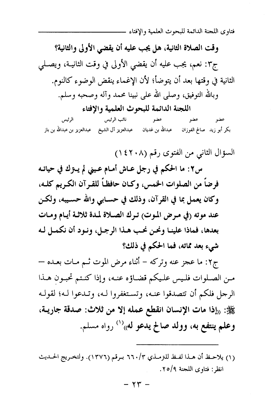 ج 2: ما عجز عنه وتركه- أثناء مرض الموت ثم مات بعده - من الصلوات فليس عليكم قضاؤه عنه، وإذا كنتم تحبون هذا الرجل فلكم أن تتصدقوا عنه، وتستغفروا له، وتدعوا له؛ لقوله صلى الله عليه وسلم «إذا مات الإنسان انقطع عمله إلا من ثلاث: صدقة جارية، وعلم ينتفع به، وولد صالح يدعو له (¬1) » رواه مسلم.