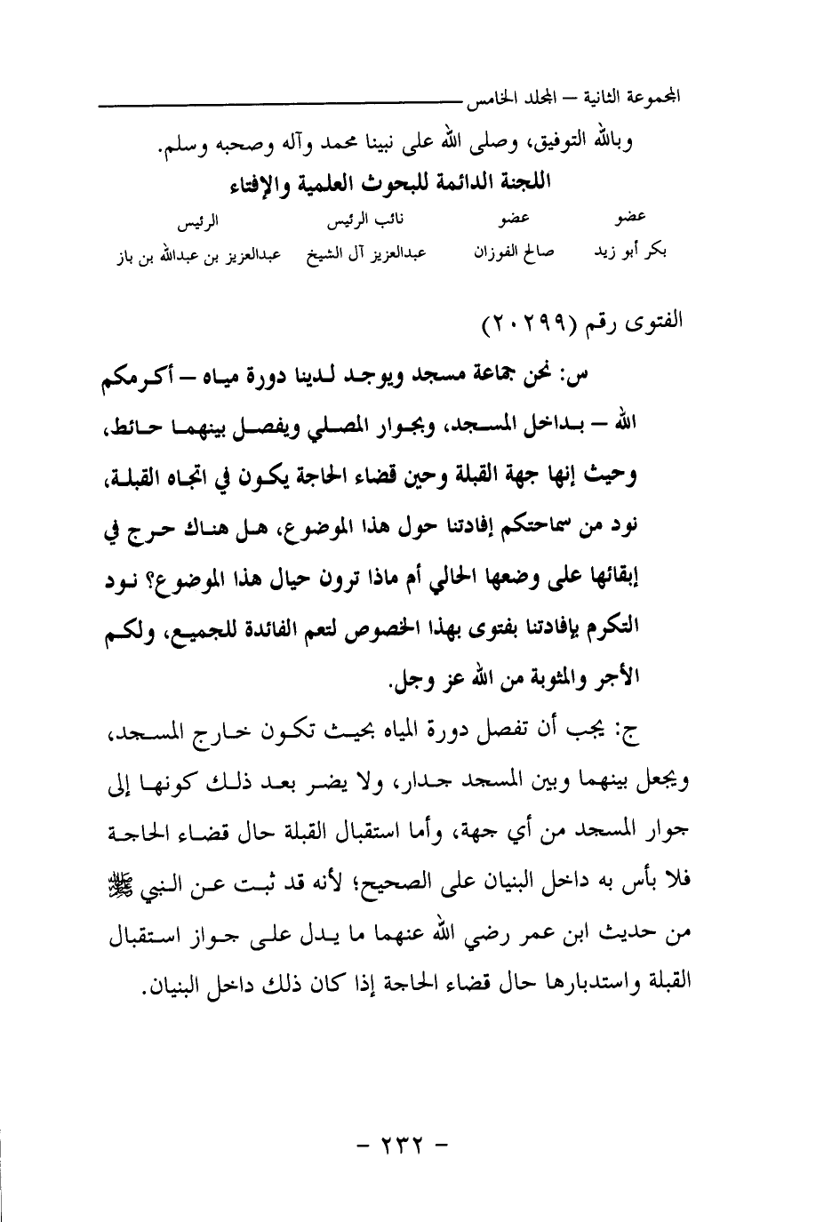 ج: يجب أن تفصل دورة المياه بحيث تكون خارج المسجد، ويجعل بينهما وبين المسجد جدار، ولا يضر بعد ذلك كونها إلى جوار المسجد من أي جهة، وأما استقبال القبلة حال قضاء الحاجة فلا بأس به داخل البنيان على الصحيح؛ لأنه قد ثبت عن النبي صلى الله عليه وسلم من حديث ابن عمر رضي الله عنهما ما يدل على جواز استقبال القبلة واستدبارها حال قضاء الحاجة إذا كان ذلك داخل البنيان.