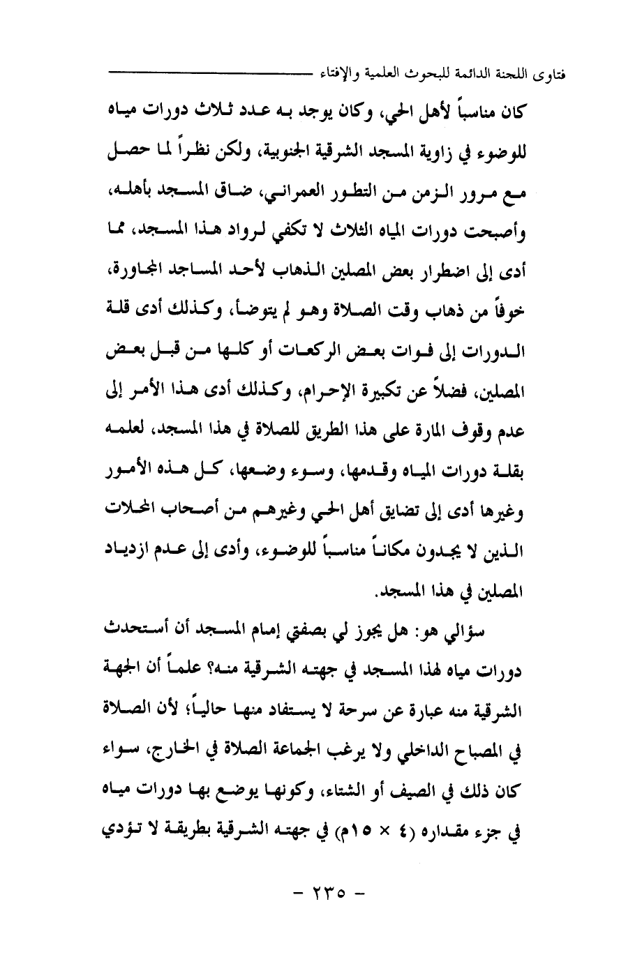 سؤال هو: هل يجوز لي بصفتي إمام المسجد أن أستحدث دورات مياه لهذا المسجد في جهته الشرقية منه؟ علما أن الجهة الشرقية منه عبارة عن سرحة لا يستفاد منها حاليا؛ لأن الصلاة في المصباح الداخلي ولا يرغب الجماعة الصلاة في الخارج، سواء كان ذلك في الصيف أو الشتاء، وكونها يوضع بها دورات مياه في جزء مقداره (4×15م) في جهته الشرقية بطريقة لا تؤدي