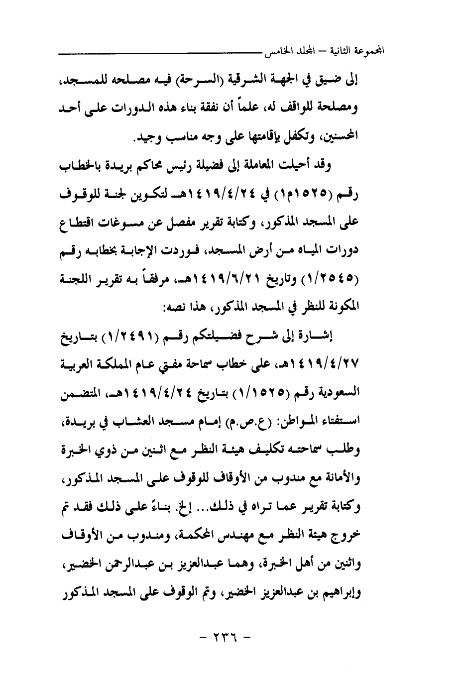 وقد أحيلت المعاملة إلى فضيلة رئيس محاكم بريدة بالخطاب رقم (1525م1) في 24\4\1419 هـ لتكوين لجنة للوقوف على المسجد المذكور، وكتابة تقرير مفصل عن مسوغات اقتطاع دورات المياه من أرض المسجد، فوردت الإجابة بخطابه رقم (2545\1) وتاريخ 21\6\1419 هـ مرفقا به تقرير اللجنة المكونة للنظر في المسجد المذكور، هذا نصه: