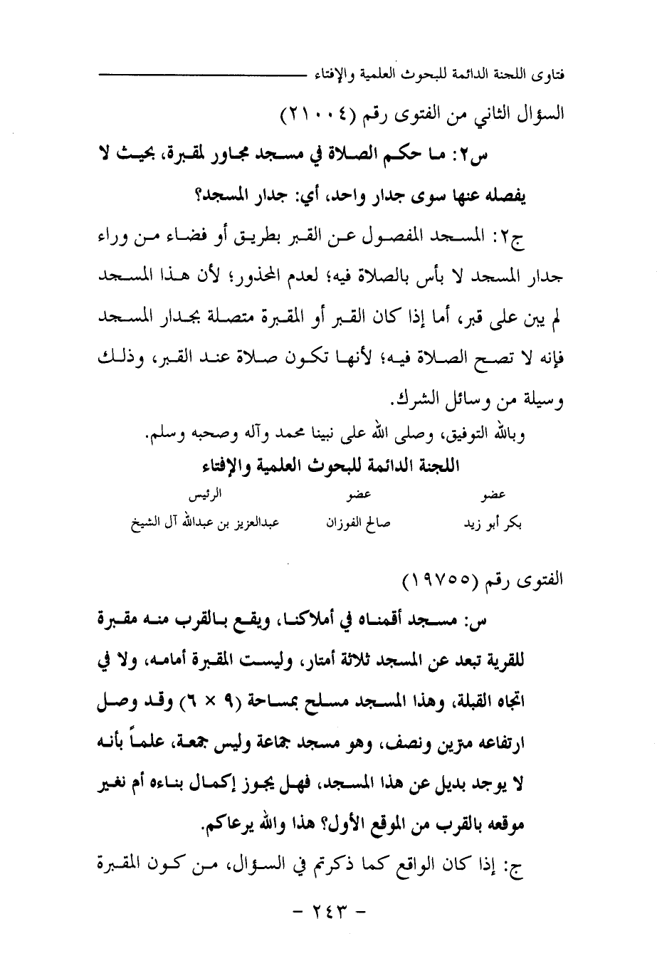 ج 2: المسجد المفصول عن القبر بطريق أو فضاء من وراء جدار المسجد لا بأس بالصلاة فيه؛ لعدم المحذور، لأن هذا المسجد لم يبن على قبر، أما إذا كان القبر أو المقبرة متصلة بجدار المسجد فإنه لا تصح الصلاة فيه؛ لأنها تكون صلاة عند القبر، وذلك وسيلة من وسائل الشرك.