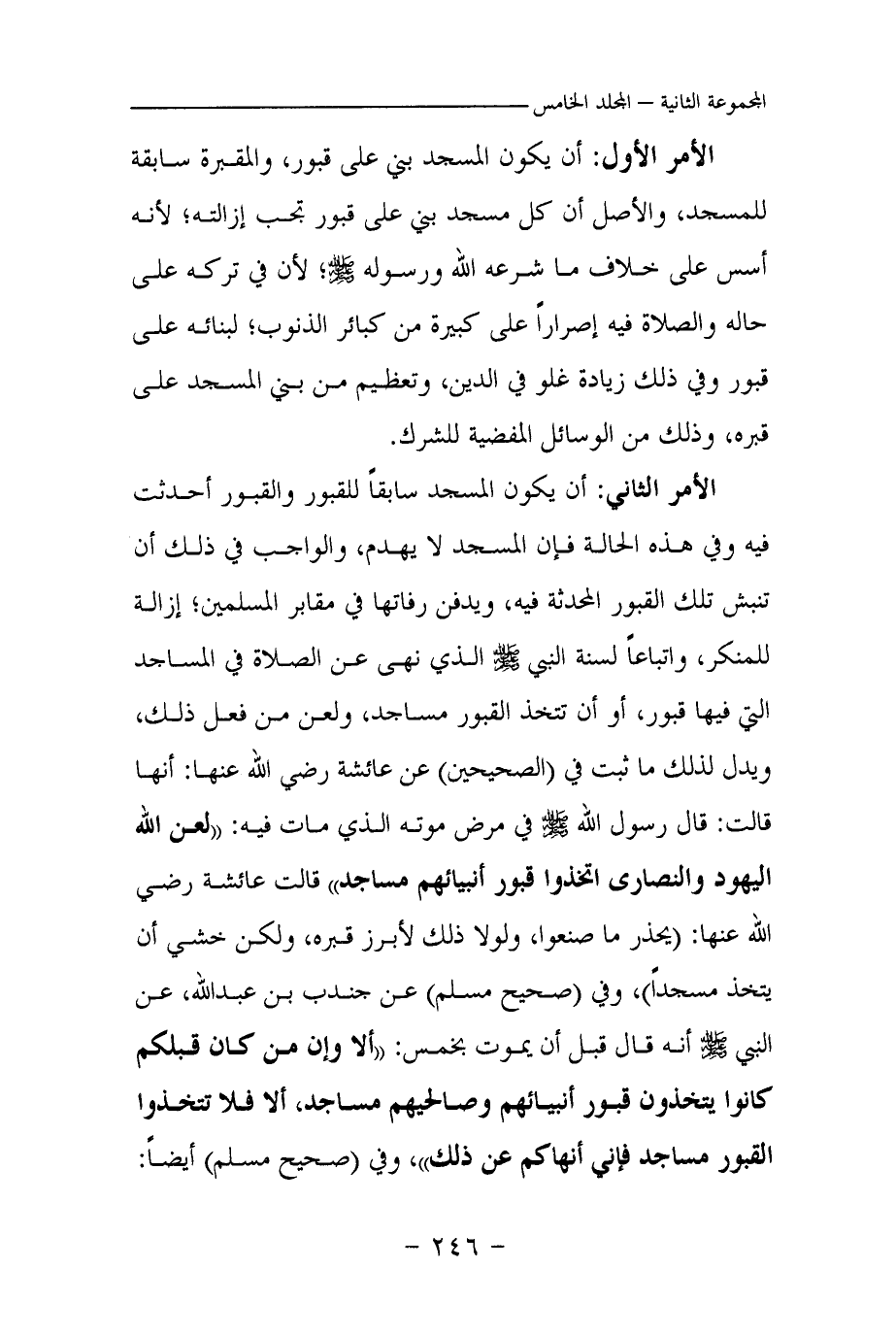 الأمر الثاني: أن يكون المسجد سابقا للقبور والقبور أحدثت فيه وفي هذه الحالة فإن المسجد لا يهدم، والواجب في ذلك أن تنبش تلك القبور المحدثة فيه، ويدفن رفاتها في مقابر المسلمين؛ إزالة للمنكر، واتباعا لسنة النبي صلى الله عليه وسلم الذي نهى عن الصلاة في المساجد التي فيها قبور، أو أن تتخذ القبور مساجد، ولعن من فعل ذلك، ويدل لذلك ما ثبت في (الصحيحين) عن عائشة رضي الله عنها: أنها قالت: قال رسول الله صلى الله عليه وسلم في مرض موته الذي مات فيه: «لعن الله اليهود والنصارى اتخذوا قبور أنبيائهم مساجد (¬1) » قالت عائشة رضي الله عنها: «يحذر ما صنعوا، ولولا ذلك لأبرز قبره، ولكن خشي أن يتخذ مسجدا (¬2) » ، وفي (صحيح مسلم) عن جندب بن عبد الله، عن النبي صلى الله عليه وسلم أنه قال قبل أن يموت بخمس: «ألا وإن من كان قبلكم كانوا يتخذون قبور أنبيائهم وصالحيهم مساجد، ألا فلا تتخذوا القبور مساجد فإني أنهاكم عن ذلك (¬3) » ، وفي (صحيح مسلم) أيضا: