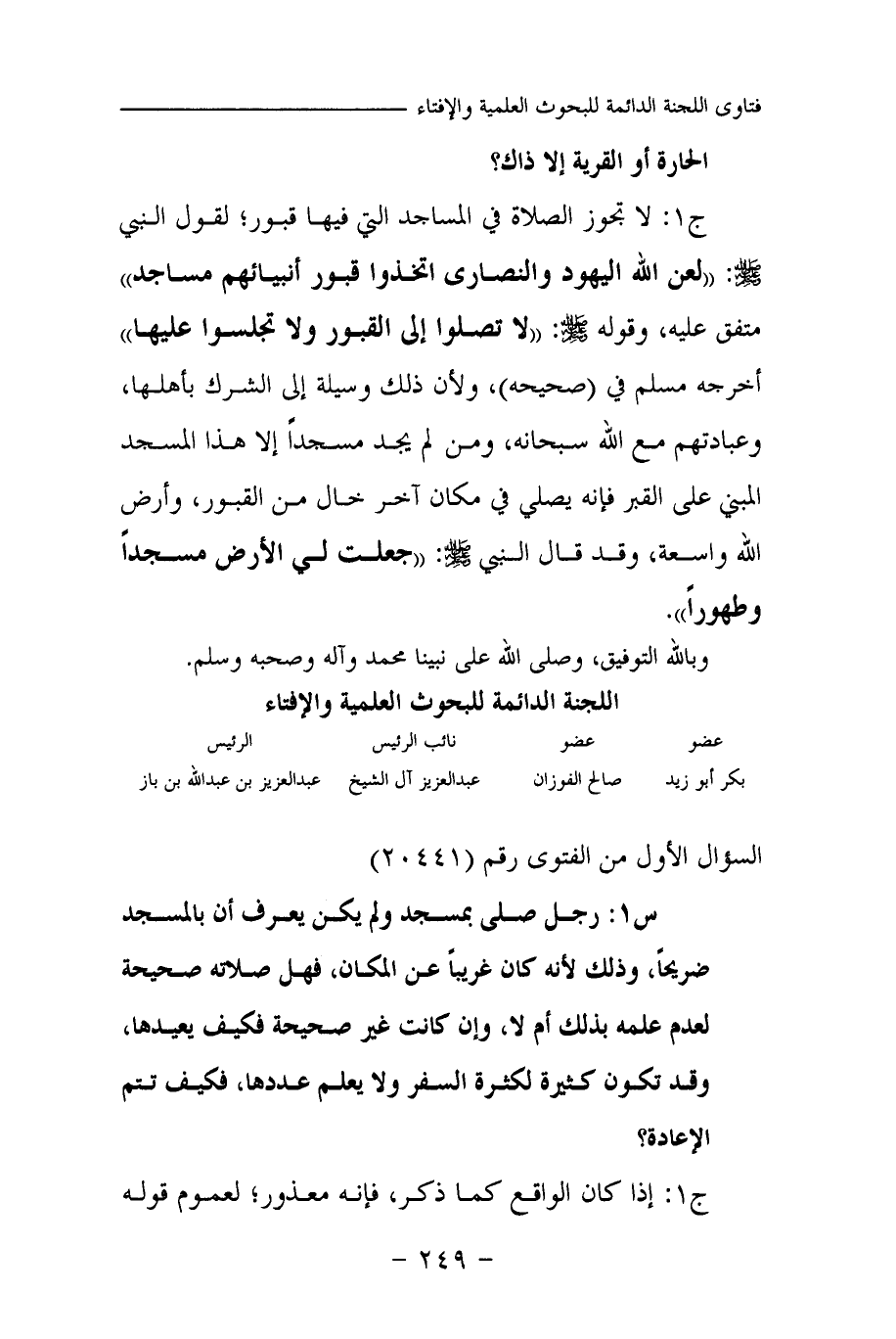 ج 1: لا تجوز الصلاة في المساجد التي فيها قبور؛ لقول النبي صلى الله عليه وسلم: «لعن الله اليهود والنصارى اتخذوا قبور أنبيائهم مساجد (¬1) » متفق عليه، وقوله صلى الله عليه وسلم: «لا تصلوا إلى القبور ولا تجلسوا عليها (¬2) » أخرجه مسلم في (صحيحه) ، ولأن ذلك وسيلة إلى الشرك بأهلها، وعبادتهم مع الله سبحانه، ومن لم يجد مسجدا إلا هذا المسجد المبني على القبر فإنه يصلي في مكان آخر خال من القبور، وأرض الله واسعة، وقد قال النبي صلى الله عليه وسلم: «جعلت لي الأرض مسجدا وطهورا (¬3) » .