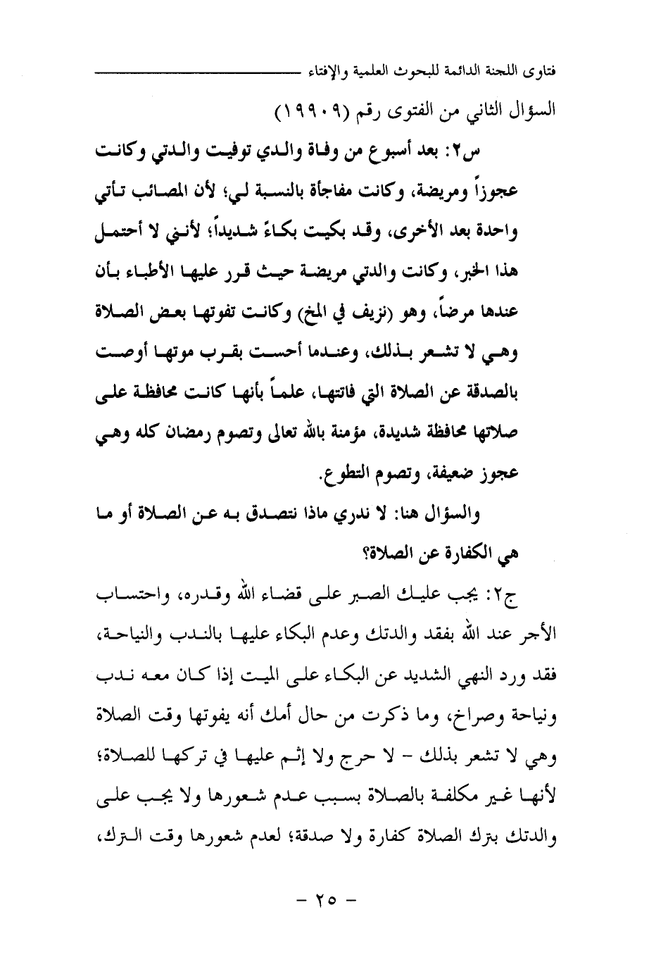 س 2: بعد أسبوع من وفاة والدي توفيت والدتي وكانت عجوزا ومريضة، وكانت مفاجأة بالنسبة لي؛ لأن المصائب تأتي واحدة بعد الأخرى، وقد بكيت بكاء شديدا؛ لأنني لا أحتمل هذا الخبر، وكانت والدتي مريضة حيث قرر عليها الأطباء بأن عندها مرضا، وهو (نزيف في المخ) وكانت تفوتها بعض الصلاة وهي لا تشعر بذلك، وعندما أحست بقرب موتها أوصت بالصدقة عن الصلاة التي فاتتها، علما بأنها كانت محافظة على صلاتها محافظة شديدة، مؤمنة بالله تعالى وتصوم رمضان كله وهي عجوز ضعيفة، وتصوم التطوع.
