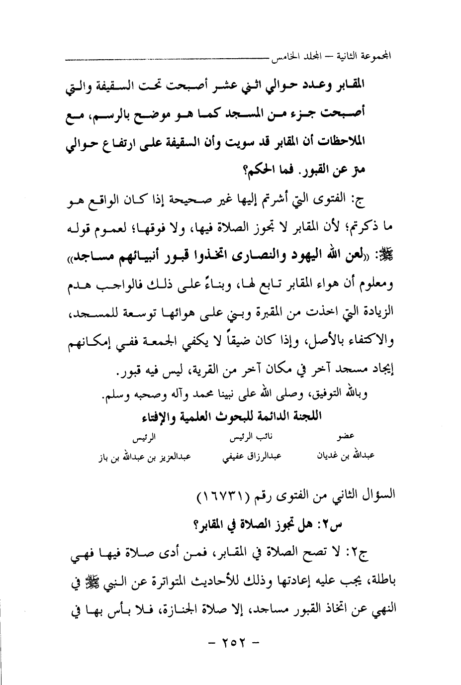 ج: الفتوى التي أشرتم إليها غير صحيحة إذا كان الواقع هو ما ذكرتم؛ لأن المقابر لا تجوز الصلاة فيها، ولا فوقها؛ لعموم قوله صلى الله عليه وسلم: «لعن الله اليهود والنصارى اتخذوا قبور أنبيائهم مساجد (¬1) » ومعلوم أن هواء المقابر تابع لها وبناء على ذلك فالواجب هدم الزيادة التي أخذت من المقبرة وبني على هوائها توسعة للمسجد، والاكتفاء بالأصل، وإذا كان ضيقا لا يكفي الجمعة ففي إمكانهم إيجاد مسجد آخر في مكان آخر من القرية، ليس فيه قبور.