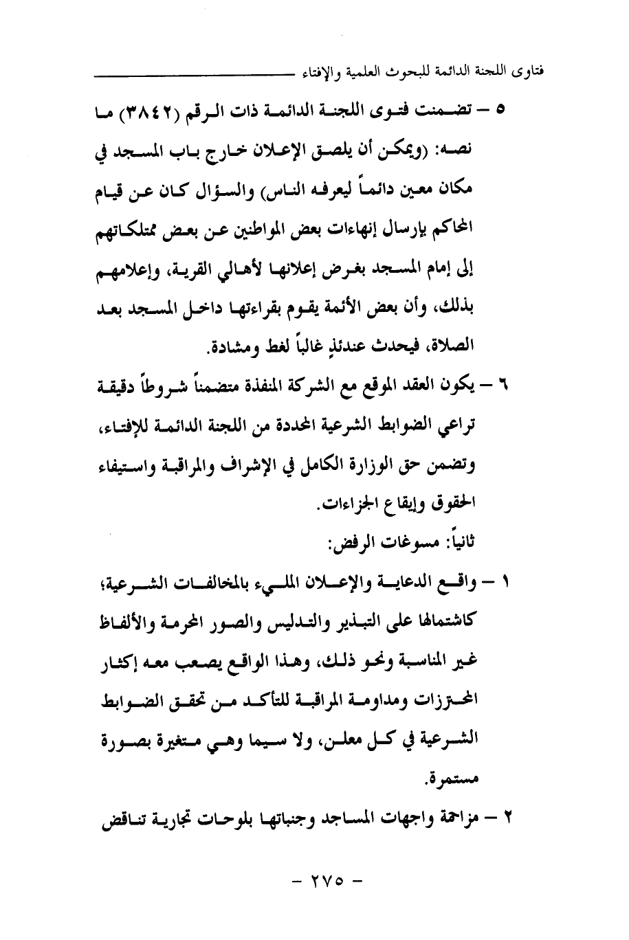 5- تضمنت فتوى اللجنة الدائمة ذات الرقم (3842) ما نصه: (ويمكن أن يلصق الإعلان خارج باب المسجد في مكان معين دائما ليعرفه الناس) والسؤال كان عن قيام المحاكم إرسال إنهاءات بعض المواطنين عن بعض ممتلكاتهم إلى إمام المسجد بغرض إعلانها لأهالي القرية، وإعلامهم بذلك، وأن بعض الأئمة يقوم بقراءتها داخل المسجد بعد الصلاة، فيحدث عندئذ غالبا لغط ومشادة.
