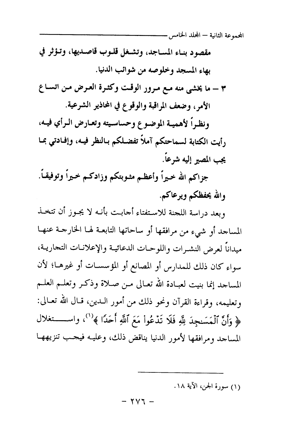 وبعد دراسة اللجنة للاستفتاء أجابت بأنه لا يجوز أن تتخذ المساجد أو شيء من مرافقها أو ساحاتها التابعة لها الخارجة عنها ميدانا لعرض النشرات واللوحات الدعائية والإعلانات التجارية، سواء كان ذلك للمدارس أو المصانع أو المؤسسات أو غيرها؛ لأن المساجد إنما بنيت لعبادة الله تعالى من صلاة وذكر وتعلم العلم وتعليمه، وقراءة القرآن ونحو ذلك من أمور الدين، قال الله تعالى: {وَأَنَّ الْمَسَاجِدَ لِلَّهِ فَلَا تَدْعُوا مَعَ اللَّهِ أَحَدًا} (¬1) واستغلال المساجد ومرافقها لأمور الدنيا يناقض ذلك، وعليه فيجب تنزيهها