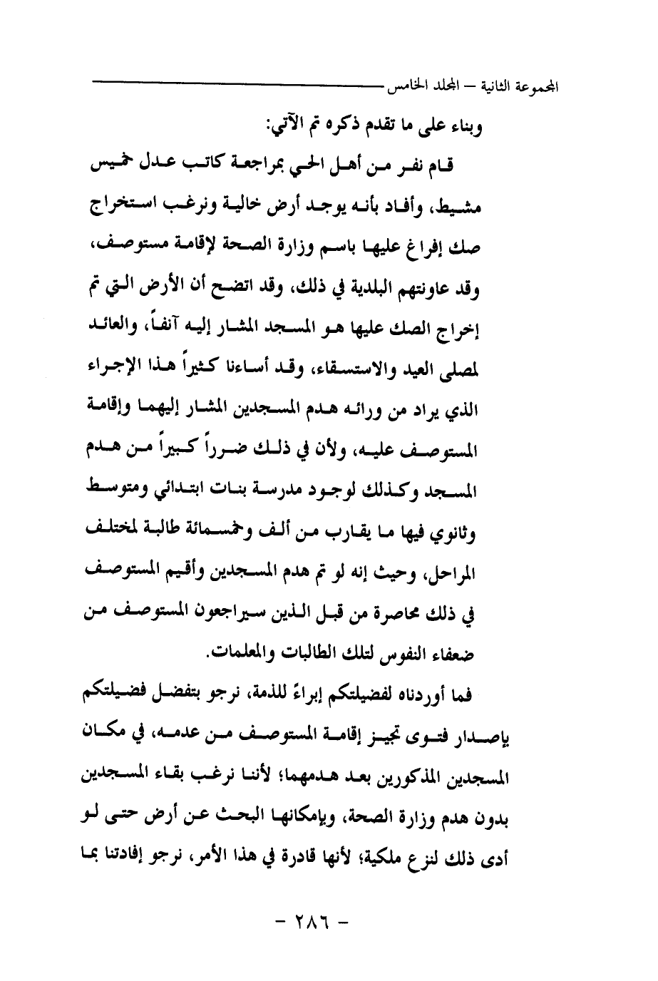 قام نفر من أهل الحي بمراجعة كاتب عدل خميس مشيط، وأفاد بأنه يوجد أرض خالية ونرغب استخراج صك إفراغ عليها باسم وزارة الصحة لإقامة مستوصف، وقد عاونتهم البلدية في ذلك، وقد اتضح أن الأرض التي تم إخراج الصك عليها هو المسجد المشار إليه آنفا، والعائد لمصلى العيد والاستسقاء، وقد أساءنا كثيرا هذا الإجراء الذي يراد من ورائه هدم المسجدين المشار إليهما وإقامة المستوصف عليه، ولأن في ذلك ضررا كبيرا من هدم المسجد وكذلك لوجود مدرسة بنات ابتدائي ومتوسط وثانوي فيها ما يقارب من ألف وخمسمائة طالبة لمختلف المراحل، وحيث إنه لو تم هدم المسجدين وأقيم المستوصف في ذلك محاصرة من قبل الذين سيراجعون المستوصف من ضعفاء النفوس لتلك الطالبات والمعلمات.