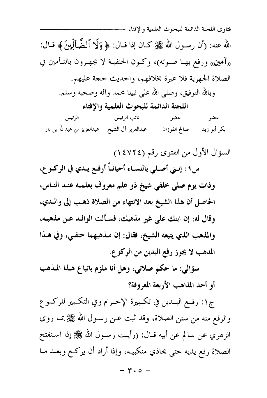 س 1: إنني أصلي بالناس أحيانا أرفع يدي في الركوع، وذات يوم صلى خلفي شيخ ذو علم معروف بعلمه عند الناس، الحاصل أن هذا الشيخ بعد الانتهاء من الصلاة ذهب إلى والدي، وقال له: إن ابنك على غير مذهبك، فسألت الوالد عن مذهبه، والمذهب الذي يتبعه الشيخ، فقال: إن مذهبهما حنفي، وفي هذا المذهب لا يجوز رفع اليدين من الركوع.