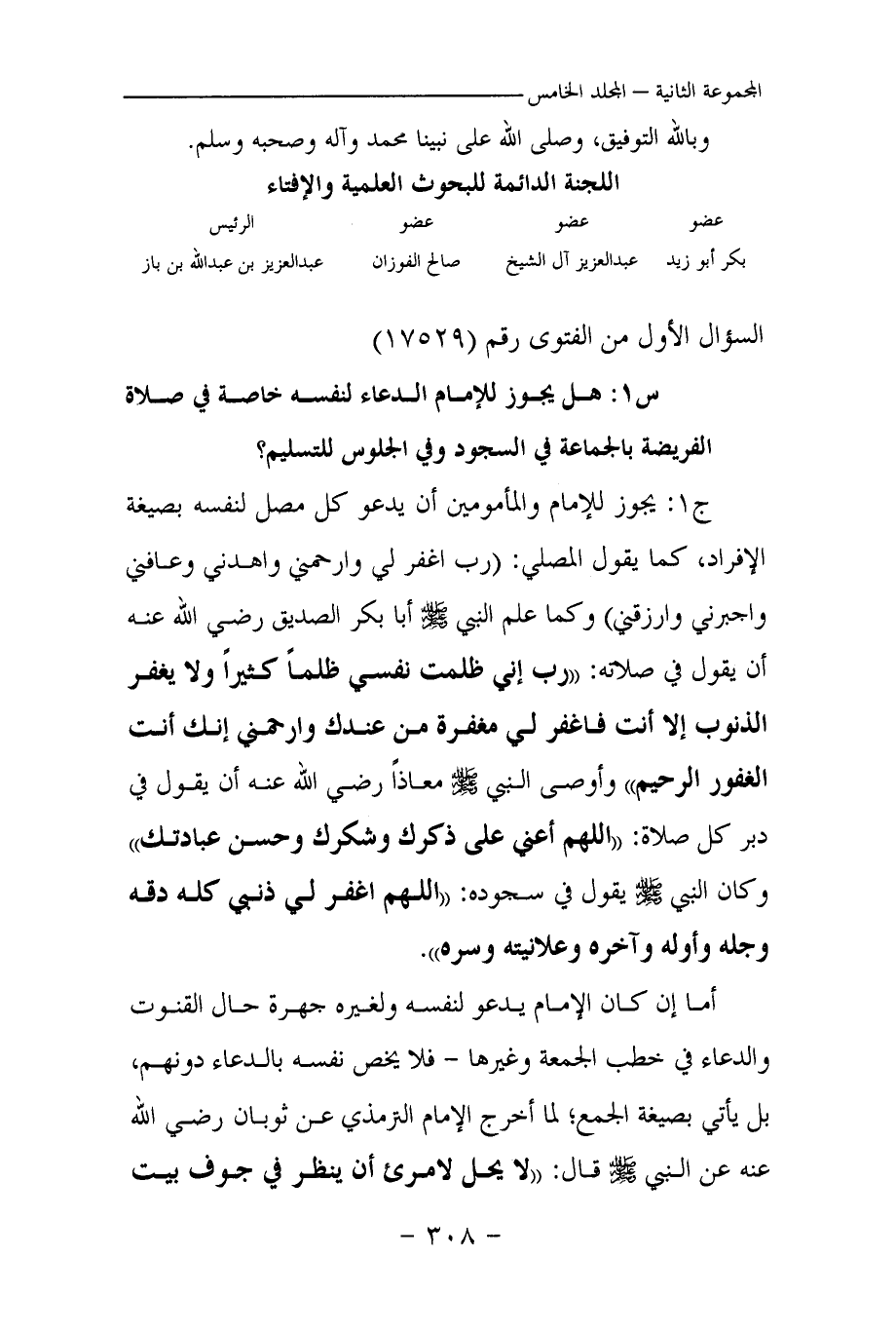 س 1: هل يجوز للإمام الدعاء لنفسه خاصة في صلاة الفريضة بالجماعة في السجود وفي الجلوس للتسليم؟