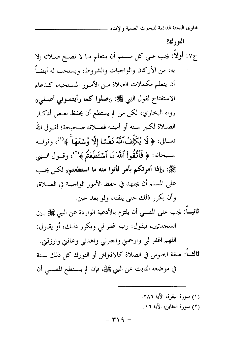 ج 7: أولا: يجب على كل مسلم أن يتعلم ما لا تصح صلاته إلا به، من الأركان والواجبات والشروط، ويستحب له أيضا أن يتعلم مكملات الصلاة من الأمور المستحبة، كدعاء الاستفتاح لقول النبي صلى الله عليه وسلم: «صلوا كما رأيتموني أصلي (¬1) » رواه البخاري، لكن من لم يستطع أن يحفظ بعض أذكار الصلاة لكبر سنه أو أميته فصلاته صحيحة، لقول الله تعالى: {لَا يُكَلِّفُ اللَّهُ نَفْسًا إِلَّا وُسْعَهَا} (¬2) ، وقوله سبحانه: {فَاتَّقُوا اللَّهَ مَا اسْتَطَعْتُمْ} (¬3) ، وقول النبي صلى الله عليه وسلم: «إذا أمرتكم بأمر فأتوا منه ما استطعتم (¬4) » لكن يجب على المسلم أن يجتهد في حفظ الأمور الواجبة في الصلاة، وأن يكرر ذلك حتى يتقنه، ولو بعد حين.