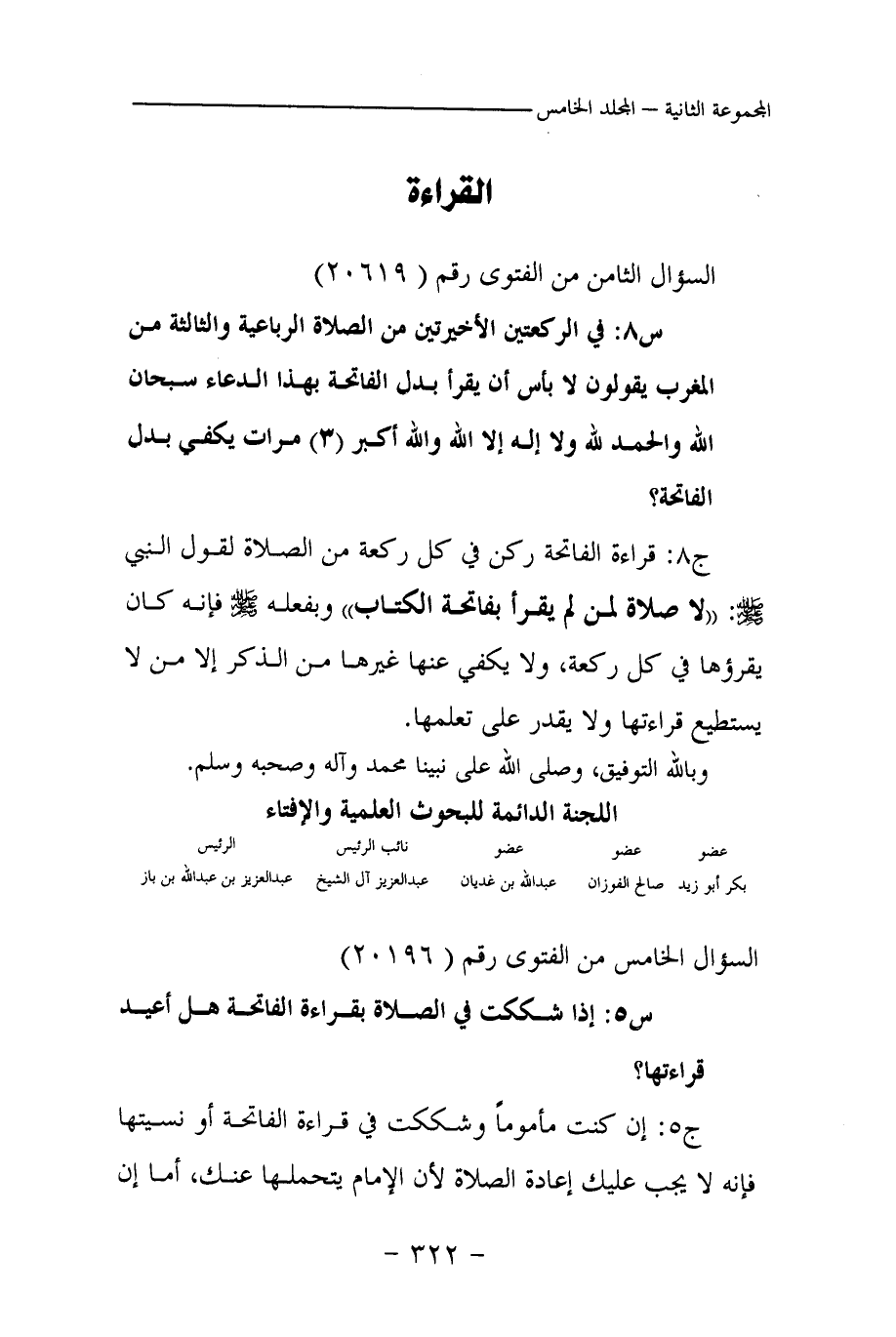 س 5: إذا شككت في الصلاة بقراءة الفاتحة هل أعيد قراءتها؟