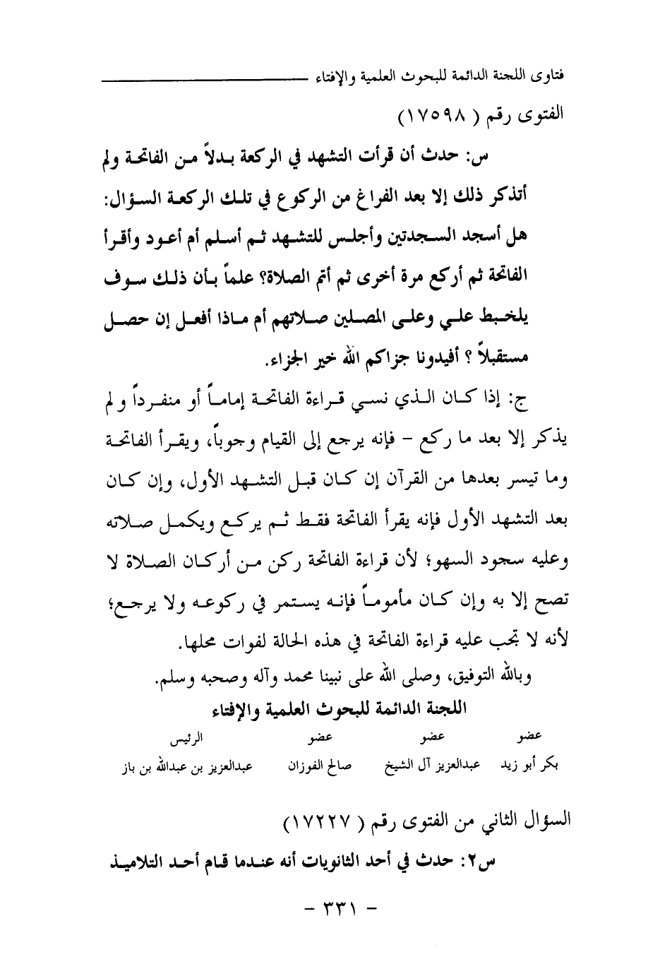 س: حدث أن قرأت التشهد في الركعة بدلا من الفاتحة ولم أتذكر ذلك إلا بعد الفراغ من الركوع في تلك الركعة السؤال: هل أسجد السجدتين وأجلس للتشهد ثم أسلم أم أعود وأقرأ الفاتحة ثم أركع مرة أخرى ثم أتم الصلاة؟ علما بأن ذلك سوف يلخبط علي وعلى المصلين صلاتهم أم ماذا أفعل إن حصل مستقبلا؟ أفيدونا جزاكم الله خير الجزاء.