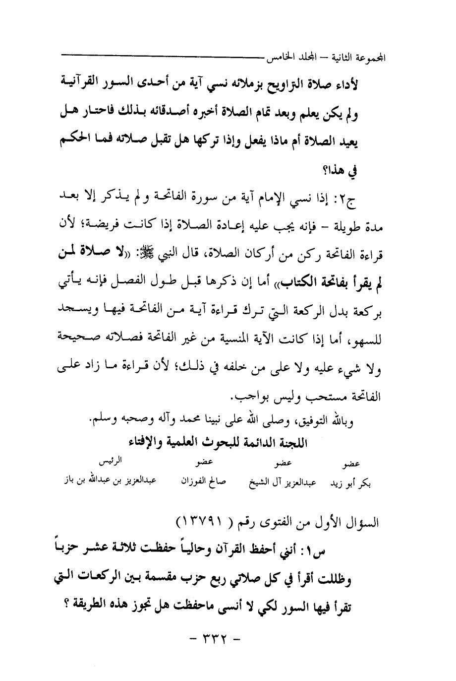 ج 2: إذا نسي الإمام آية من سورة الفاتحة ولم يذكر إلا بعد مدة طويلة - فإنه يجب عليه إعادة الصلاة إذا كانت فريضة؛ لأن قراءة الفاتحة ركن من أركان الصلاة، قال النبي صلى الله عليه وسلم: «لا صلاة لمن لم يقرأ بفاتحة الكتاب (¬1) » أما إن ذكرها قبل طول الفصل فإنه يأتي بركعة بدل الركعة التي ترك قراءة آية من الفاتحة فيها ويسجد للسهو، أما إذا كانت الآية المنسية من غير الفاتحة فصلاته صحيحة ولا شيء عليه ولا على من خلفه في ذلك، لأن قراءة ما زاد على الفاتحة مستحب وليس بواجب.