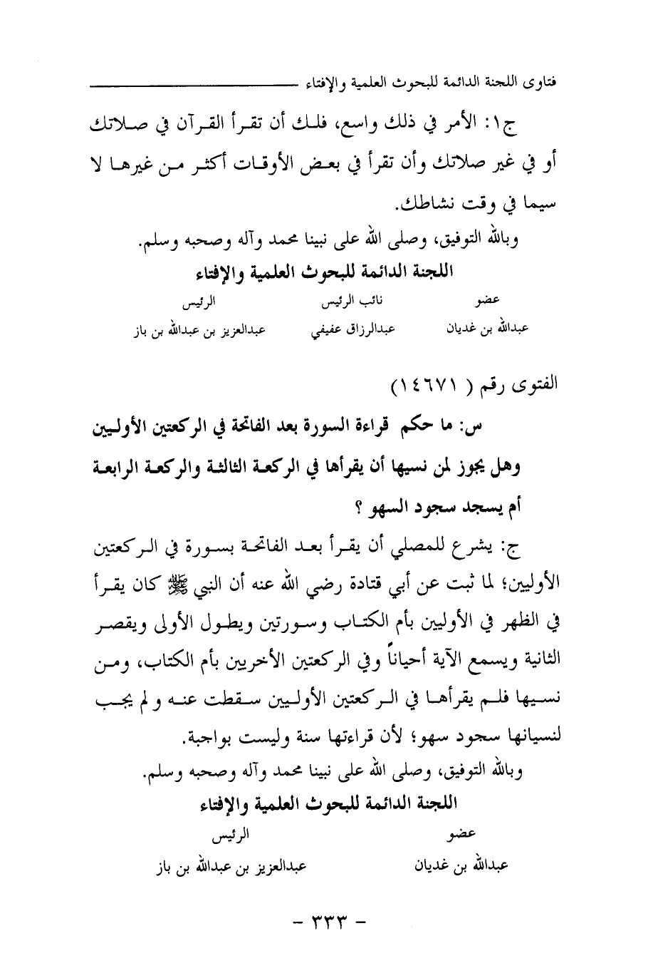 س: ما حكم قراءة السورة بعد الفاتحة في الركعتين الأوليين وهل يجوز لمن نسيها أن يقرأها في الركعة الثالثة والركعة الرابعة أم يسجد سجود السهو؟
