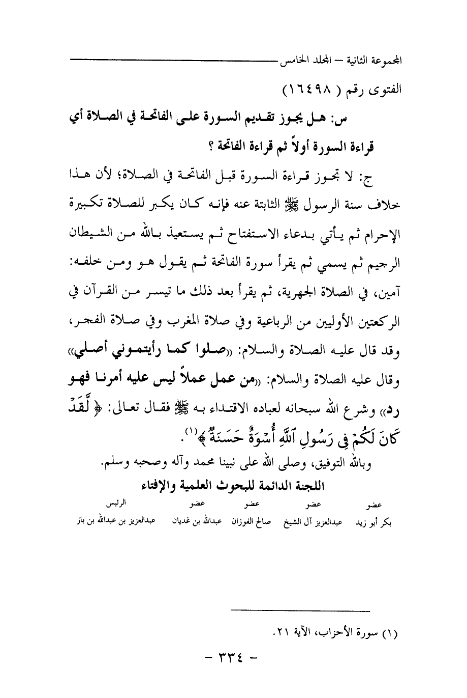 ج: لا تجوز قراءة السورة قبل الفاتحة في الصلاة، لأن هذا خلاف سنة الرسول صلى الله عليه وسلم الثابتة عنه فإنه كان يكبر للصلاة تكبيرة الإحرام تم يأتي بدعاء الاستفتاح ثم يستعيذ بالله من الشيطان الرجيم ثم يسمي ثم يقرأ سورة الفاتحة ثم يقول هو ومن خلفه: آمين، في الصلاة الجهرية، ثم يقرأ بعد ذلك ما تيسر من القرآن في الركعتين الأوليين من الرباعية وفي صلاة المغرب وفي صلاة الفجر، وقد قال عليه الصلاة والسلام: «صلوا كما رأيتموني أصلي (¬1) » وقال عليه الصلاة والسلام: «من عمل عملا ليس عليه أمرنا فهو رد (¬2) » وشرع الله سبحانه لعباده الاقتداء به صلى الله عليه وسلم فقال تعالى: {لَقَدْ كَانَ لَكُمْ فِي رَسُولِ اللَّهِ أُسْوَةٌ حَسَنَةٌ} (¬3) .