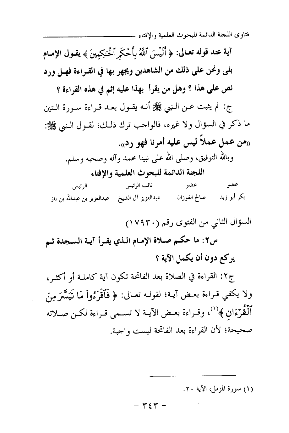 آية عند قوله تعالى: {أَلَيْسَ اللَّهُ بِأَحْكَمِ الْحَاكِمِينَ} (¬1) يقول الإمام بلى ونحن على ذلك من الشاهدين ويجهر بها في القراءة فهل ورد نص على هذا؟ وهل من يقرأ بهذا عليه إثم في هذه القراءة؟