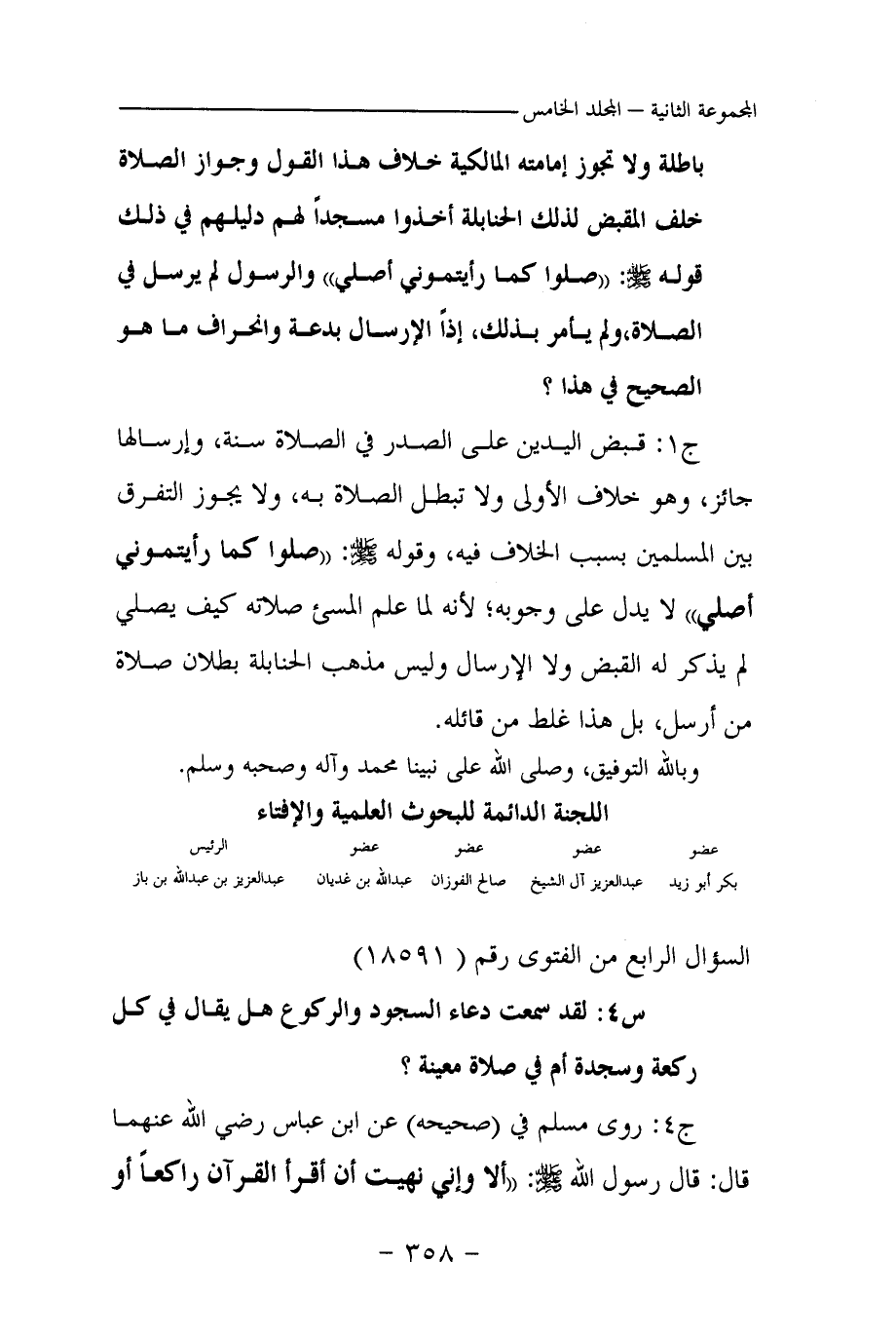 باطلة ولا تجوز إمامته المالكية خلاف هذا القول وجواز الصلاة خلف المقبض لذلك الحنابلة أخذوا مسجدا لهم دليلهم في ذلك قوله صلى الله عليه وسلم: «صلوا كما رأيتموني أصلي» والرسول لم يرسل في الصلاة، ولم يأمر بذلك، إذا الإرسال بدعة وانحراف ما هو الصحيح في هذا؟