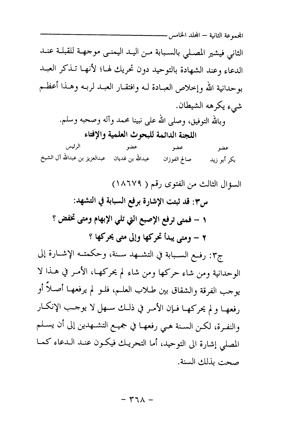 ج 3: رفع السبابة في التشهد سنة، وحكمته الإشارة إلى الوحدانية ومن شاء حركها ومن شاء لم يحركها، الأمر في هذا لا يوجب الفرقة والشقاق بين طلاب العلم، فلو لم يرفعها أصلا أو رفعها ولم يحركها فإن الأمر في ذلك سهل لا يوجب الإنكار والنفرة، لكن السنة هي رفعها في جميع التشهدين إلى أن يسلم المصلي إشارة إلى التوحيد، أما التحريك فيكون عند الدعاء كما صحت بذلك السنة.