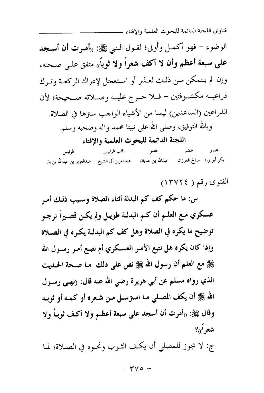 س: ما حكم كف كم البدلة أثناء الصلاة وسبب ذلك أمر عسكري مع العلم أن كم البدلة طويل ولم يكن قصيرا نرجو توضيح ما يكره في الصلاة وهل كف كم البدلة يكره في الصلاة وإذا كان يكره هل نتبع الأمر العسكري أم نتبع أمر رسول الله صلى الله عليه وسلم مع العلم أن رسول الله صلى الله عليه وسلم نص على ذلك ما صحة الحديث الذي رواه مسلم عن أبي هريرة رضي الله عنه قال: «نهى رسول الله صلى الله عليه وسلم أن يكف المصلي ما استرسل من شعره أو كمه أو ثوبه» وقال صلى الله عليه وسلم: «أمرت أن أسجد على سبعة أعظم ولا أكف ثوبا ولا شعرا» .