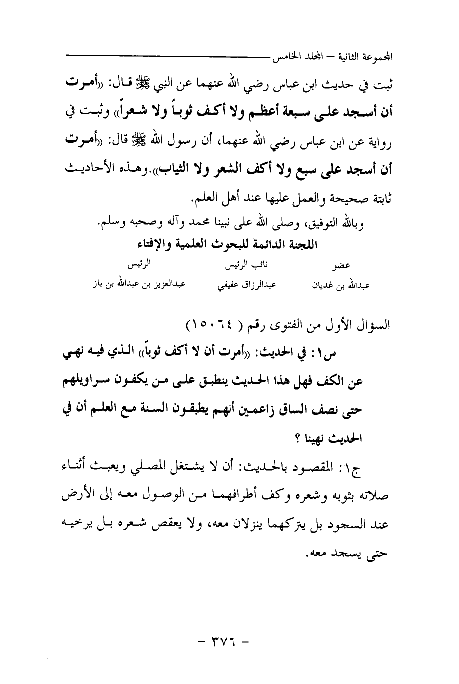 س 1: في الحديث: «أمرت أن لا أكف ثوبا» الذي فيه نهي عن الكف فهل هذا الحديث ينطبق على من يكفون سراويلهم حتى نصف الساق زاعمين أنهم يطبقون السنة مع العلم أن في الحديث نهينا؟
