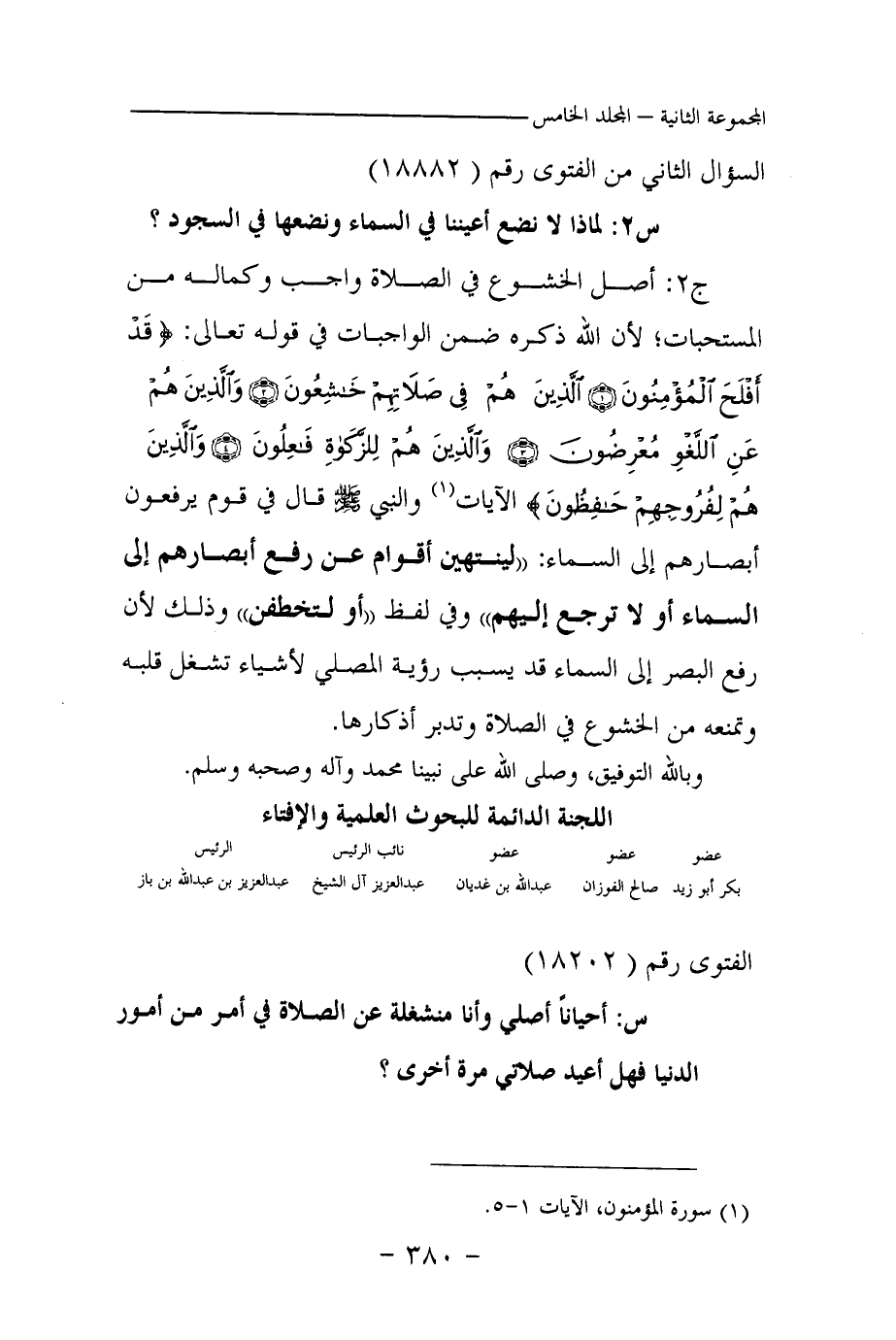 ج 2: أصل الخشوع في الصلاة واجب وكماله من المستحبات؛ لأن الله ذكره ضمن الواجبات في قوله تعالى: {قَدْ أَفْلَحَ الْمُؤْمِنُونَ} (¬1) {الَّذِينَ هُمْ فِي صَلَاتِهِمْ خَاشِعُونَ} (¬2) {وَالَّذِينَ هُمْ عَنِ اللَّغْوِ مُعْرِضُونَ} (¬3) {وَالَّذِينَ هُمْ لِلزَّكَاةِ فَاعِلُونَ} (¬4) {وَالَّذِينَ هُمْ لِفُرُوجِهِمْ حَافِظُونَ} (¬5) ، والنبي صلى الله عليه وسلم قال في قوم يرفعون أبصارهم إلى السماء: «لينتهين أقوام عن رفع أبصارهم إلى السماء أو لا ترجع إليهم (¬6) » وفي لفظ "أو «لتخطفن (¬7) » وذلك لأن رفع البصر إلى السماء قد يسبب رؤية المصلي لأشياء تشغل قلبه وتمنعه من الخشوع في الصلاة وتدبر أذكارها.