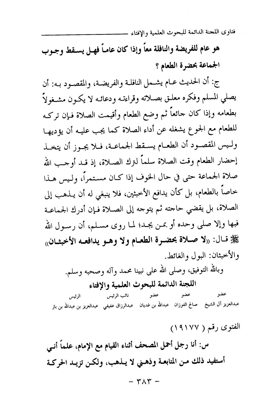 ج: إن الحديث عام يشمل النافلة والفريضة، والمقصود به: أن يصلي المسلم وفكره معلق بصلاته وقراءته ودعائه لا يكون مشغولا بطعامه وإذا كان جائعا ثم وضع الطعام وأقيمت الصلاة فإن تركه للطعام مع الجوع يشغله عن أداء الصلاة كما يجب عليه أن يؤديها وليس المقصود أن الطعام يسقط الجماعة، فلا يجوز أن يتخذ إحضار الطعام وقت الصلاة سلما لترك الصلاة، إذ قد أوجب الله صلاة الجماعة حتى في حال الخوف إذا كان مستمرا، وليس هذا خاصا بالطعام، بل كأن يدافع الأخبثين، فلا ينبغي له أن يذهب إلى الصلاة، بل يقضي حاجته ثم يتوجه إلى الصلاة فإن أدرك الجماعة فبها وإلا صلى وحده أو بمن يجد؛ لما روى مسلم، أن رسول الله صلى الله عليه وسلم قال: «لا صلاة بحضرة الطعام ولا وهو يدافعه الأخبثان (¬1) » والأخبثان: البول والغائط.