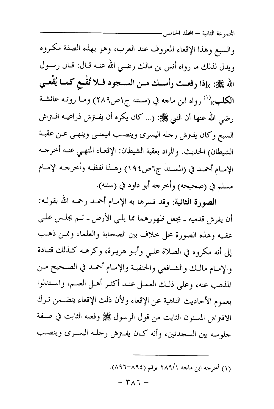 والسبع وهذا الإقعاء المعروف عند العرب، وهو بهذه الصفة مكروه ويدل لذلك ما رواه أنس بن مالك رضي الله عنه قال: قال رسول الله صلى الله عليه وسلم: «إذا رفعت رأسك من السجود فلا تقع كما يقعي الكلب (¬1) » رواه ابن ماجه في (سننه ج 1 ص 289) ، وما روته عائشة رضي الله عنها أن النبي صلى الله عليه وسلم: (. . «كان يكره أن يفترش ذراعيه افتراش السبع وكان يفترش رجله اليسرى وينصب اليمنى وينهى عن عقبة الشيطان (¬2) » الحديث. والمراد بعقبة الشيطان: الإقعاء المنهي عنه أخرجه الإمام أحمد في (المسند ج 6 ص 194) وهذا لفظه وأخرجه الإمام مسلم في (صحيحه) وأخرجه أبو داود في (سننه) .