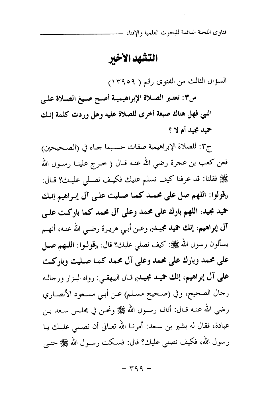 ج 3: للصلاة الإبراهيمية صفات حسبما جاء في (الصحيحين) فعن كعب بن عجرة رضي الله عنه قال «خرج علينا رسول الله صلى الله عليه وسلم فقلنا: قد عرفنا كيف نسلم عليك فكيف نصلي عليك؟ قال: (قولوا: اللهم صل على محمد كما صليت على آل إبراهيم إنك حميد مجيد، اللهم بارك على محمد وعلى آل محمد كما باركت على آل إبراهيم، إنك حميد مجيد (¬1) » وعن أبي هريرة رضي الله عنه، «أنهم يسألون رسول الله صلى الله عليه وسلم: كيف نصلي عليك؟ قال: (قولوا: اللهم صل على محمد وبارك على محمد وعلى آل محمد كما صليت وباركت على آل إبراهيم، إنك حميد مجيد» قال البيهقي: رواه البزار ورجاله رجال الصحيح، وفي (صحيح مسلم) عن أبي مسعود الأنصاري رضي الله عنه قال: «أتانا رسول الله صلى الله عليه وسلم ونحن في مجلس سعد بن عبادة، فقال له بشير بن سعد: أمرنا الله تعالى أن نصلي عليك يا رسول الله، فكيف نصلي عليك؟ قال؛ فسكت رسول الله صلى الله عليه وسلم حتى