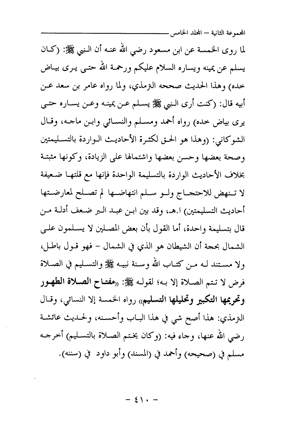 لما روى الخمسة عن ابن مسعود رضي الله عنه أن النبي صلى الله عليه وسلم: «كان يسلم عن يمينه ويساره السلام عليكم ورحمة الله حتى يرى بياض خده (¬1) » وهذا الحديث صححه الترمذي، ولما رواه عامر بن سعد عن أبيه قال: «كنت أرى النبي صلى الله عليه وسلم يسلم عن يمينه وعن يساره حتى يرى بياض خده (¬2) » رواه أحمد ومسلم والنسائي وابن ماجه، وقال الشوكاني: (وهذا هو الحق لكثرة الأحاديث الواردة بالتسليمتين وصحة بعضها وحسن بعضها واشتمالها على الزيادة، وكونها مثبتة بخلاف الأحاديث الواردة بالتسليمة الواحدة فإنها مع قلتها ضعيفة لا تنهض للاحتجاج ولو سلم انتهاضها لم تصلح لمعارضتها أحاديث التسليمتين) ا. هـ، وقد بين ابن عبد البر ضعف أدلة من قال بتسليمة واحدة، أما القول بأن بعض المصلين لا يسلمون على الشمال بحجة أن الشيطان هو الذي في الشمال - فهو قول باطل، ولا مستند له من كتاب الله وسنة نبيه صلى الله عليه وسلم والتسليم في الصلاة فرض لا تتم الصلاة إلا به؛ لقوله صلى الله عليه وسلم: «مفتاح الصلاة الطهور وتحريمها التكبير وتحليلها التسليم (¬3) » رواه الخمسة إلا النسائي، وقال الترمذي: هذا أصح شيء في هذا الباب وأحسنه، ولحديث عائشة رضي الله عنها، وجاء فيه: «وكان يختم الصلاة بالتسليم (¬4) » أخرجه مسلم في (صحيحه) وأحمد في (المسند) وأبو داود في (سننه) .