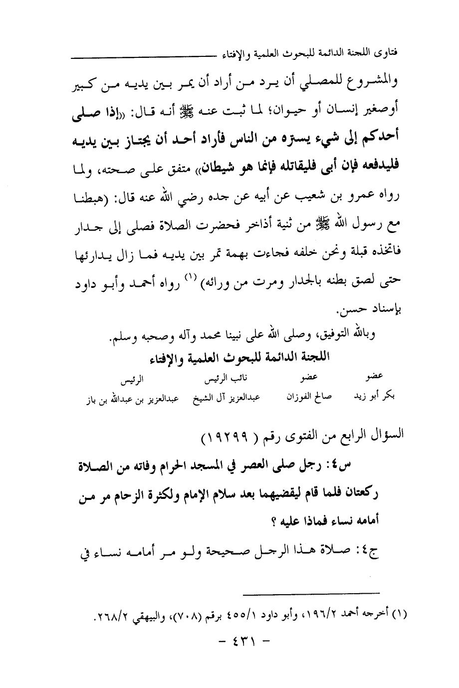 والمشروع للمصلي أن يرد من أراد أن يمر بين يديه من كبير أو صغير إنسان أو حيوان؛ لما ثبت عنه صلى الله عليه وسلم أنه قال: «إذا صلى أحدكم إلى شيء يستره من الناس فأراد أحد أن يجتاز بين يديه فليدفعه فإن أبى فليقاتله فإنما هو شيطان (¬1) » متفق على صحته، ولما رواه عمرو بن شعيب عن أبيه عن جده رضي الله عنه قال: «هبطنا مع رسول الله صلى الله عليه وسلم من ثنية أذاخر فحضرت الصلاة فصلى إلى جدار فاتخذه قبلة ونحن خلفه فجاءت بهمة تمر بين يديه فما زال يدارئها حتى لصق بطنه بالجدار ومرت من ورائه (¬2) » رواه أحمد وأبو داود بإسناد حسن.