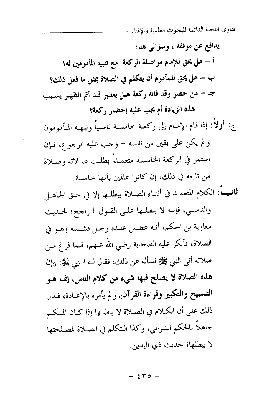 ثانيا: الكلام المتعمد في أثناء الصلاة يبطلها إلا في حق الجاهل والناسي، فإنه لا يبطلها على القول الراجح؛ لحديث معاوية بن الحكم، أنه عطس عنده رجل فشمته وهو في الصلاة، فأنكر عليه الصحابة رضي الله عنهم فلما فرغ من صلاته أتى النبي صلى الله عليه وسلم فسأله عن ذلك، فقال له النبي صلى الله عليه وسلم: «إن هذه الصلاة لا يصلح فيها شيء من كلام الناس، إنما هو التسبيح والتكبير وقراءة القرآن (¬1) » ولم يأمره بالإعادة، فدل ذلك على أن الكلام في الصلاة لا يبطلها إذا كان المتكلم جاهلا بالحكم الشرعي، وكذا التكلم في الصلاة لمصلحتها لا يبطلها؛ لحديث ذي اليدين.