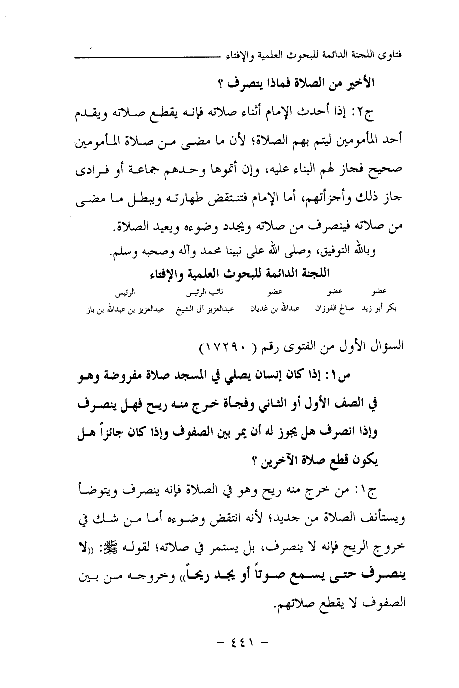 س 1: إذا كان إنسان يصلي في المسجد صلاة مفروضة وهو في الصف الأول أو الثاني وفجأة خرج منه ريح فهل ينصرف وإذا انصرف هل يجوز له أن يمر بين الصفوف وإذا كان جائزا هل يكون قطع صلاة الآخرين؟