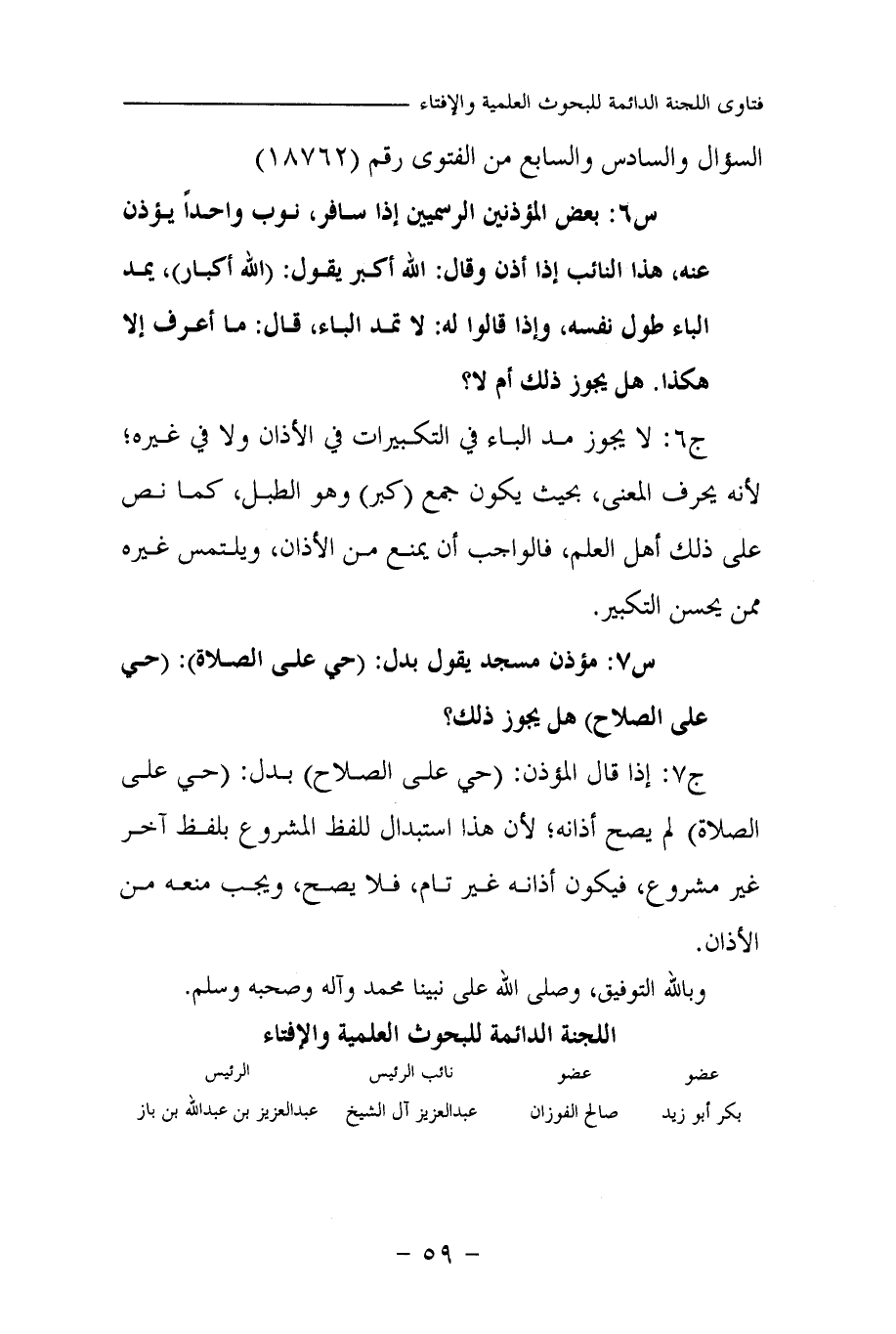 س 6: بعض المؤذنين الرسمين إذا سافر، نوب واحدا يؤذن عنه، هذا النائب إذا أذن وقال: الله أكبر يقول: (الله أكبار) ، يمد الباء طول نفسه، وإذا قالوا له: لا تمد الباء، قال: ما أعرف إلا هكذا هل يجوز ذلك أم لا؟