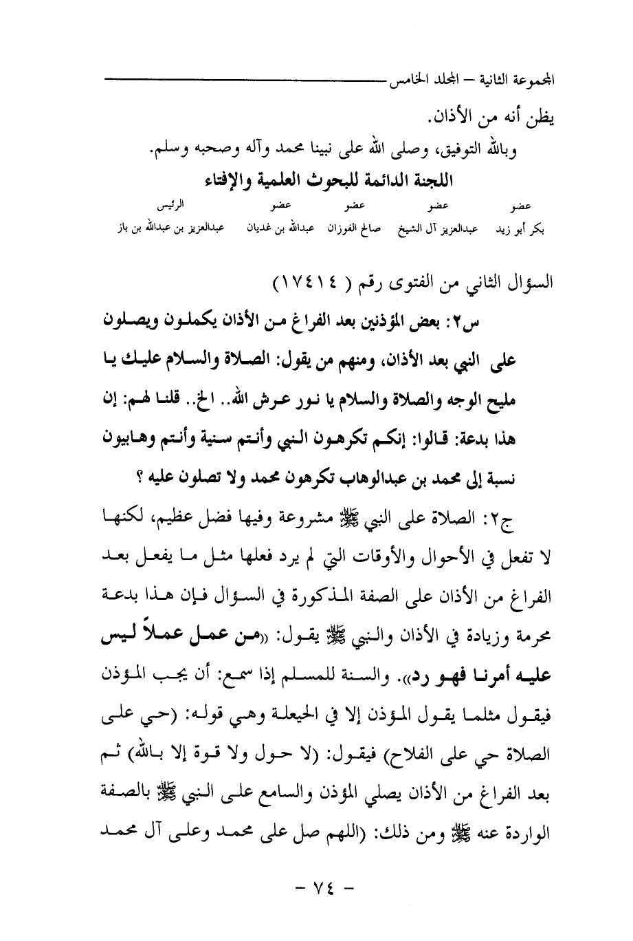 س 2: بعض المؤذنين بعد الفراغ من الأذان يكملون ويصلون على النبي بعد الأذان، ومنهم من يقول: الصلاة والسلام عليك يا مليح الوجه والصلاة والسلام يا نور عرش الله. . إلخ. . قلنا لهم: إن هذا بدعة: قال: إنكم تكرهون النبي وأنتم سنية وأنتم وهابيون نسبة إلى محمد بن عبد الوهاب تكرهون محمدا ولا تصلون عليه؟