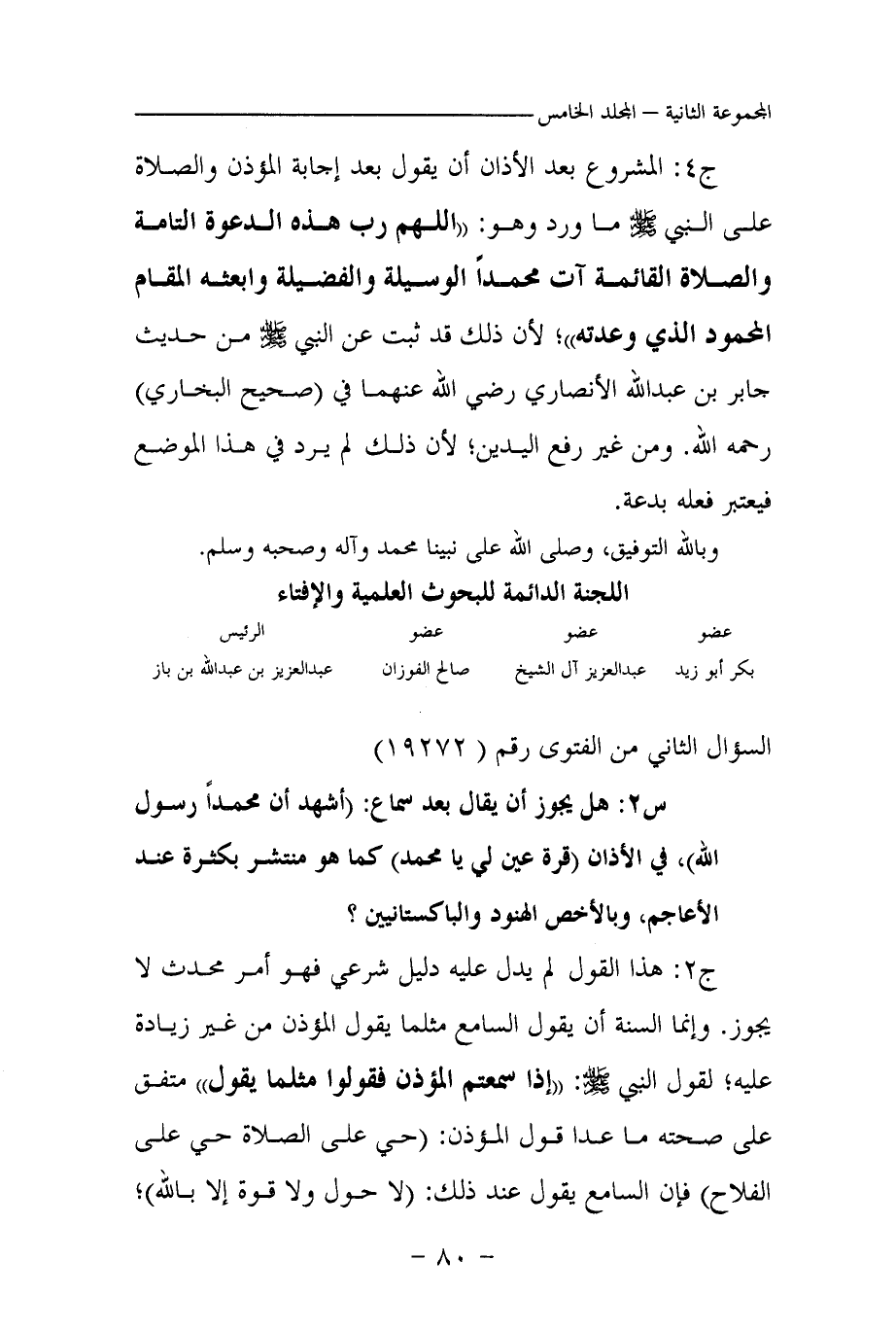 ج 4: المشروع بعد الأذان أن يقول بعد إجابة المؤذن والصلاة على النبي صلى الله عليه وسلم ما ورد وهو: «اللهم رب هذه الدعوة التامة والصلاة القائمة آت محمدا الوسيلة والفضيلة وابعثه المقام المحمود الذي وعدته (¬1) » ؛ لأن ذلك قد ثبت عن النبي صلى الله عليه وسلم من حديث جابر بن عبد الله الأنصاري رضي الله عنهما في (صحيح البخاري) رحمه الله، ومن غير رفع اليدين؛ لأن ذلك لم يرد في هذا الموضع فيعتبر فعله بدعة.
