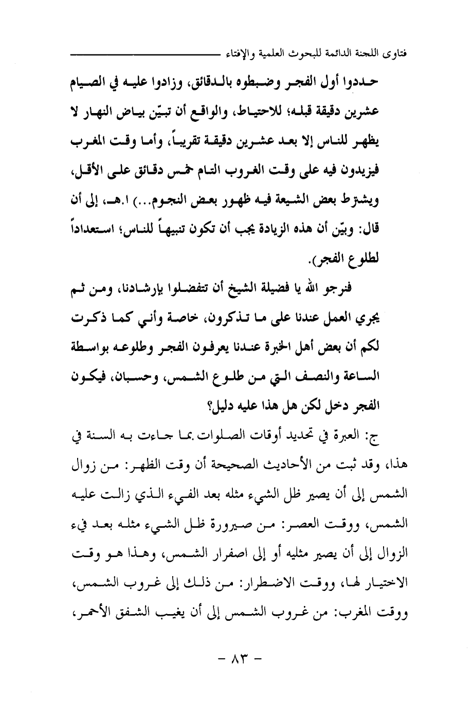 حددوا أول الفجر وضبطوه بالدقائق، وزادوا عليه في الصيام عشرين دقيقة قبله؛ للاحتياط، والواقع أن تبين بياض النهار لا يظهر للناس إلا بعد عشرين دقيقة تقريبا، وأما وقت المغرب فيزيدون فيه على وقت الغروب التام خمس دقائق على الأقل، ويشترط بعض الشيعة فيه ظهور بعض النجوم. . .) ا. هـ إلى أن قال: وبين أن هذه الزيادة يجب أن تكون تنبيها للناس؛ استعدادا لطلوع الفجر) .