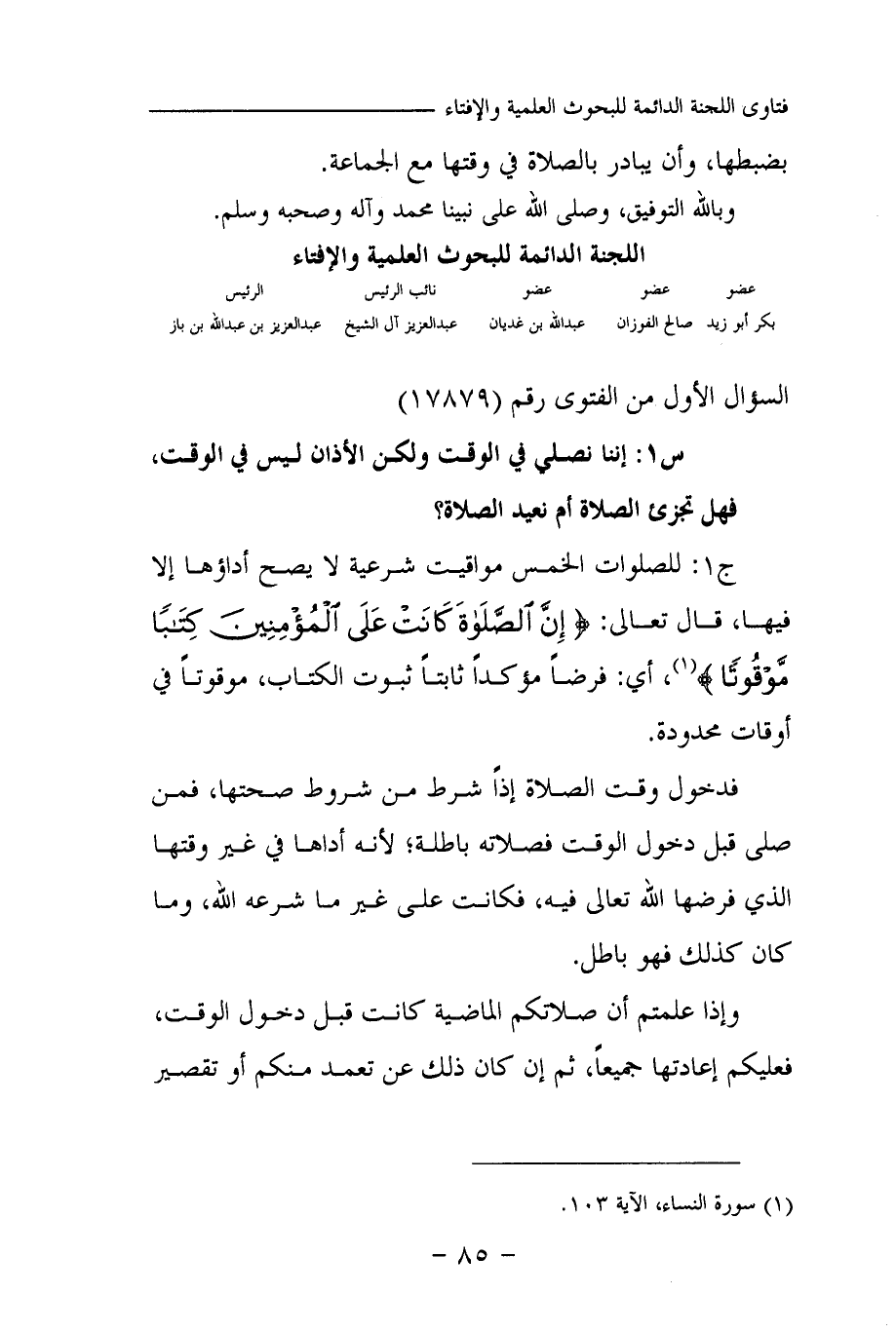 س 1: إننا نصلي في الوقت ولكن الأذان ليس في الوقت، فهل تجزئ الصلاة أم نعيد الصلاة؟